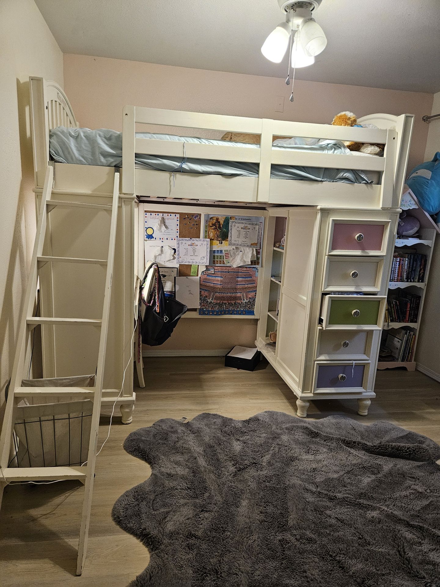 Precious bunk bed very sturdy, save space , it has Desk with 1 long drawer, Library and drawers all Built-in. 81"L x 43"W x 77"H