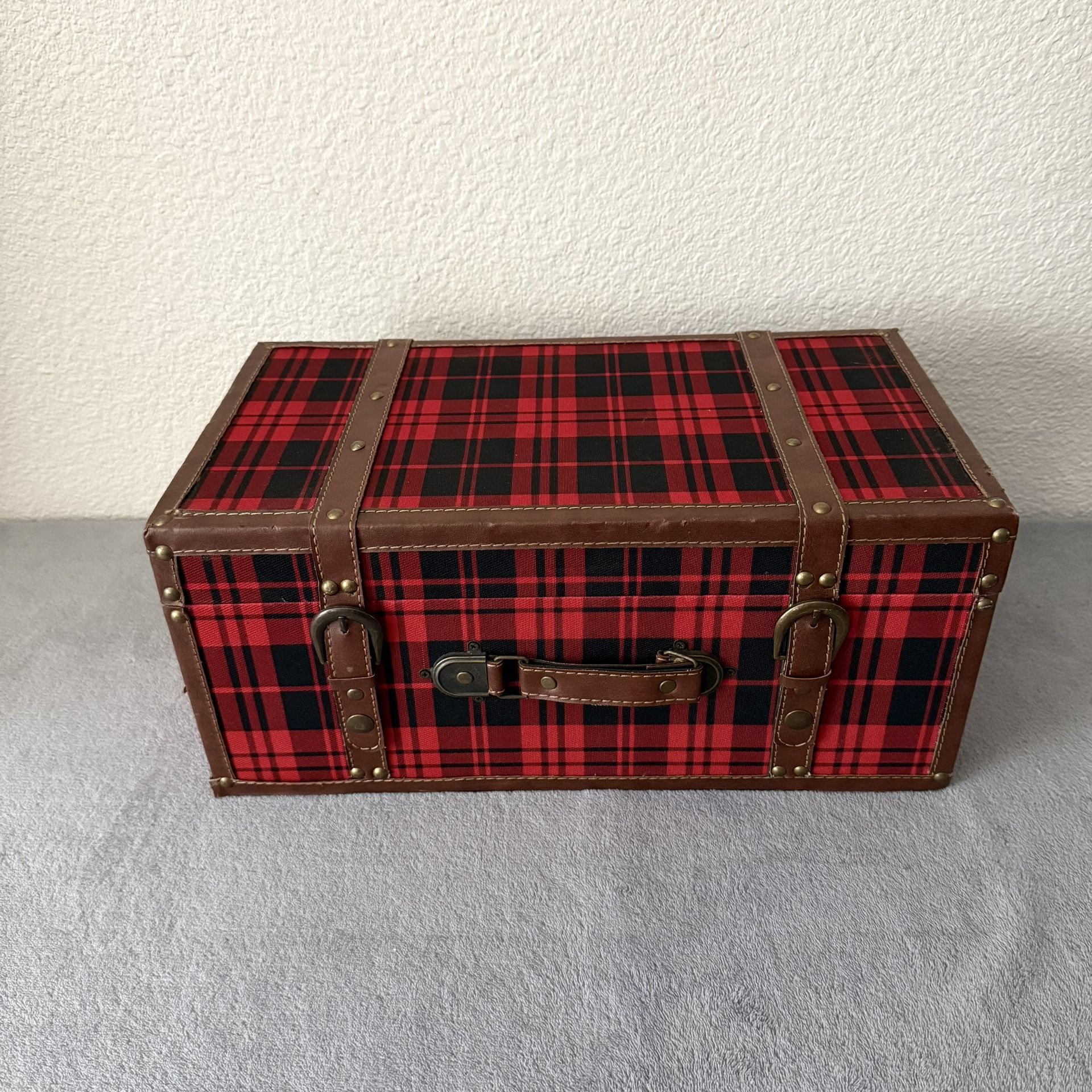plaid nested trunk is festive, functional, and fun! Not only store all you need, it add a merry mood to your holiday home. • Plaid fabric covering • Faux leather accents • Snap closure Approx: 7 1/2" H x 17" L x 9 1/4 W Some scuffs on faux leather trim Cash only Pick up only