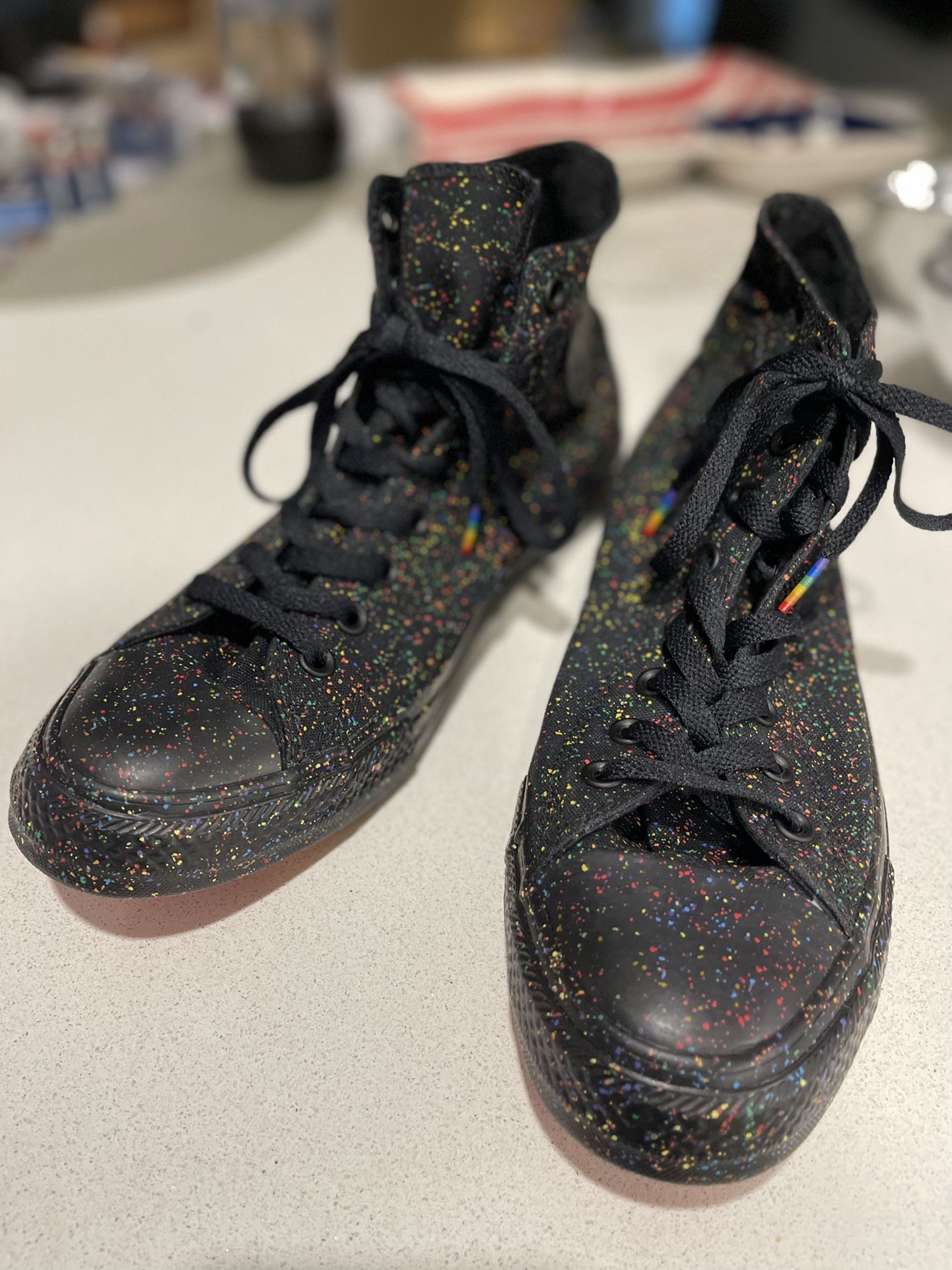 LIMITED EDITION! New In Box Converse Pride High Tops! No longer available on Converse Size: Mens 9.5 Womens 11 Just in time for all of your Pride Activities! Never been worn. Jackson Pollack splatter design, Rainbow Soles, Pride tongue patch , rainbow shoelace cap,