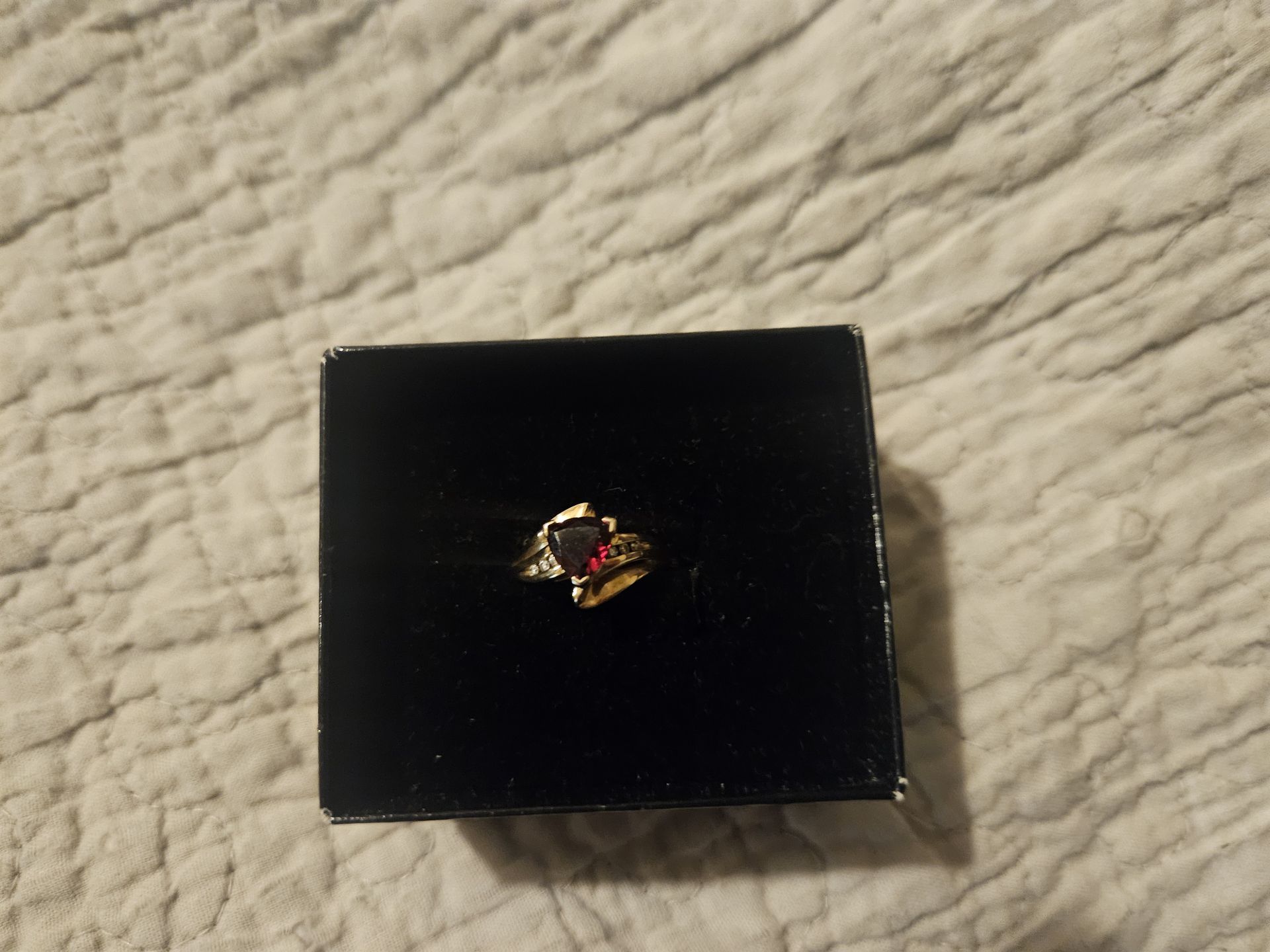 Hello selling a 10k ring with a garnet stone in the middle and small diamonds on each side i believe either size 8 or 9 270 obo dont be shy to make an offer has to go selling of my collections thanks weighs 3 grams i dont have a good scale so it you like to bring your own that be fine thanks