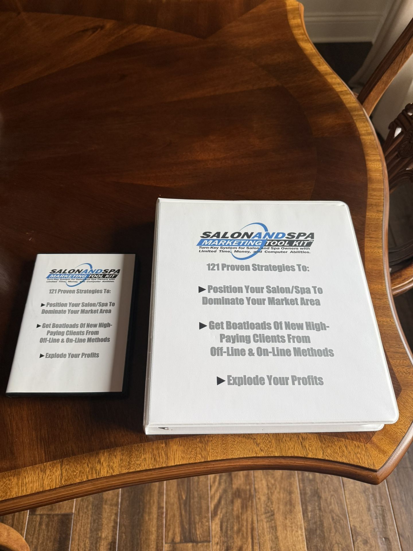 Complete SALON AND SPA TOOL KIT. Get proven marketing strategies to position your salon/spa to dominate your market area. Comes with the “121 Proven Strategies” binder and 10 marketing booklets. Also includes about 30+ CD’s to follow and bonus content.