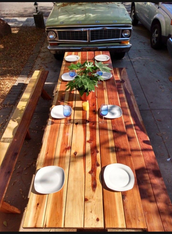 Custom Artisan handmade. Redwood sanded to 320 grit and will last a very long time outdoors. 10 feet long with unattached 10 ft benches. Can comfortably sit 12-14 people. Can produce other benches and lengths such as from Douglas fir. Wood grain may vary (but that's the fun part!). Thanks for your time and supporting a small woodworking business! I've been woodworking for 6+ years around SoCal. Customer's always came back with a compliment!