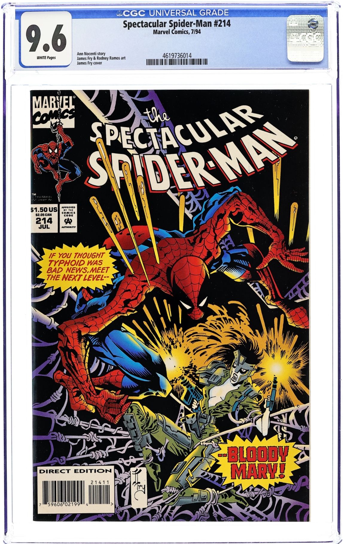 "Bloody Justice" Part 2 of 2. Script by Ann Nocenti. Pencils by James Fry. Inks by Rodney Ramos, Keith Williams, and Michael Higgins. Cover by James Fry. Typhoid Mary and her multiple personalities are on the loose across Manhattan! And despite barely surviving his earlier encounter against them, the wondrous wall-crawler scours the city looking for the psychotic killer! Spider-Man finally catches up to Mary inside a luxurious townhouse as she is preparing to slaughter her next victim! And that sets the stage for a ferocious fight to the finish between Bloody Mary and the Spectacular Spider-Man! (Notes: Typhoid Mary returns in Deadpool (1st series) 6. This issue includes a fold out back cover featuring upcoming Marvel releases.) 32 pages