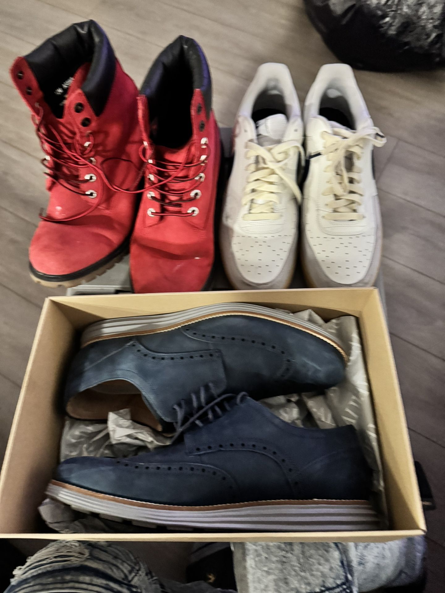 I have three pairs of men shoes, the red Tim’s are size 12 the white Nike are size 13 and the Johnston and Murphy’s are size 11.5. Tim’s $30 Nikes $30 Johnston’s $50
