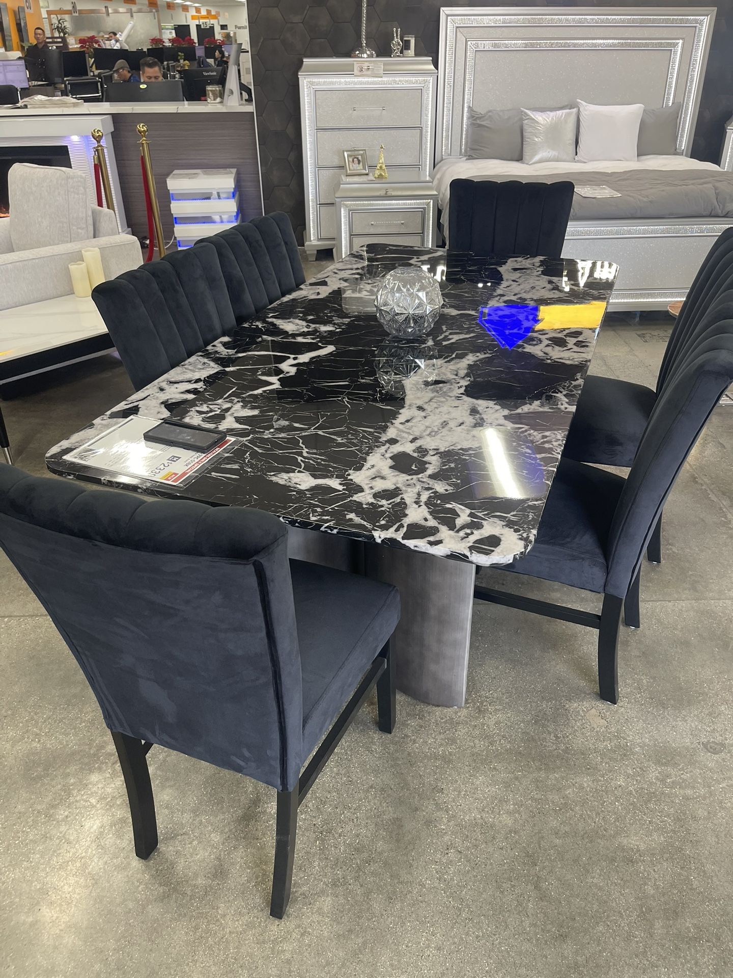 78”L Dining Table With Black Stone Top + 6 Black Dining Chairs