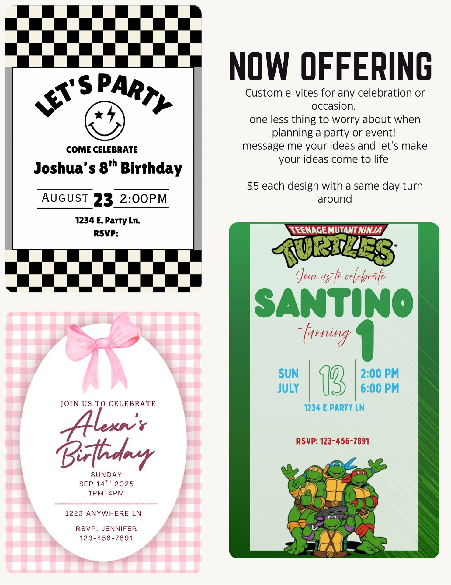 In case you need an e-vite created and don’t have the time, skill (it’s easy but still), or the patience I’m now offering custom e-vites for any occasion or celebration Same day turn around