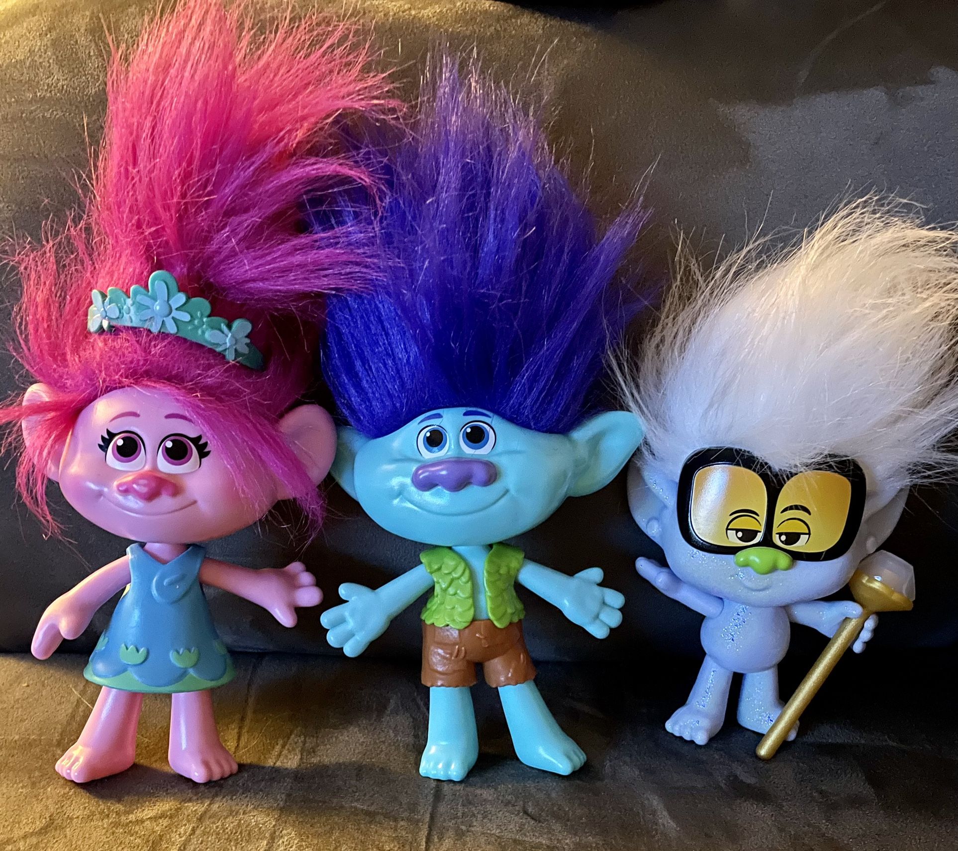 TROLLS WORLD TOUR THREE DOLL SET FRIENDSHIP PACK E9085 POPPY BRANCH TINY DIAMOND Like new, no box. Pre-Owned. See all pictures to see how good the condition is with your own eyes. The Poppy doll includes a removable dress and a tiara. The Branch doll has removable shorts and vest, The Tiny Diamond doll includes his signature scepter. Children can style the troll hair on each of these fun dolls using the included brush and hair clip. There's even a brush and hair clip so children can style their wild hair all sorts of ways as they recreate favorite scenes from the film with these dolls or make up their own new adventures! Smoke free home. Check out my page for more great stuff to buy!