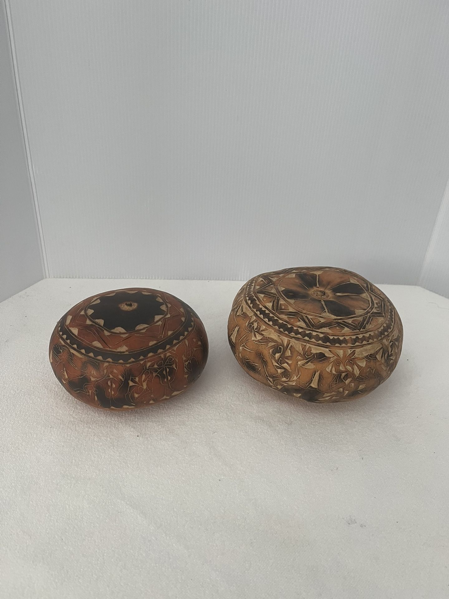 2 Vintage Indigenous Peruvian Gourd Sun Rattle Instrument Handmade Decoration