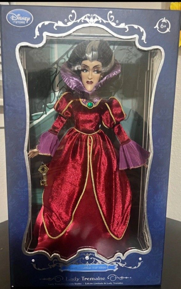 Lady Tremaine limited edition Doll rare • Limited Edition of 1500 • Includes Certificate of Authenticity • Burgundy velvet gown and bodice with intricate golden piping • Stand-up collar of pleated lilac satin • Scoop neck inlay with sparkling lilac rhinestones • Deep burgundy satin skirt • Green gemstone brooch with matching earrings • Golden attic key with satin ribbon • Display stand included • Ages 6+ • Plastic /polyester • 17'' H • Imported • A great pairing with the LE 1500 Cinderella Doll, sold separately.
