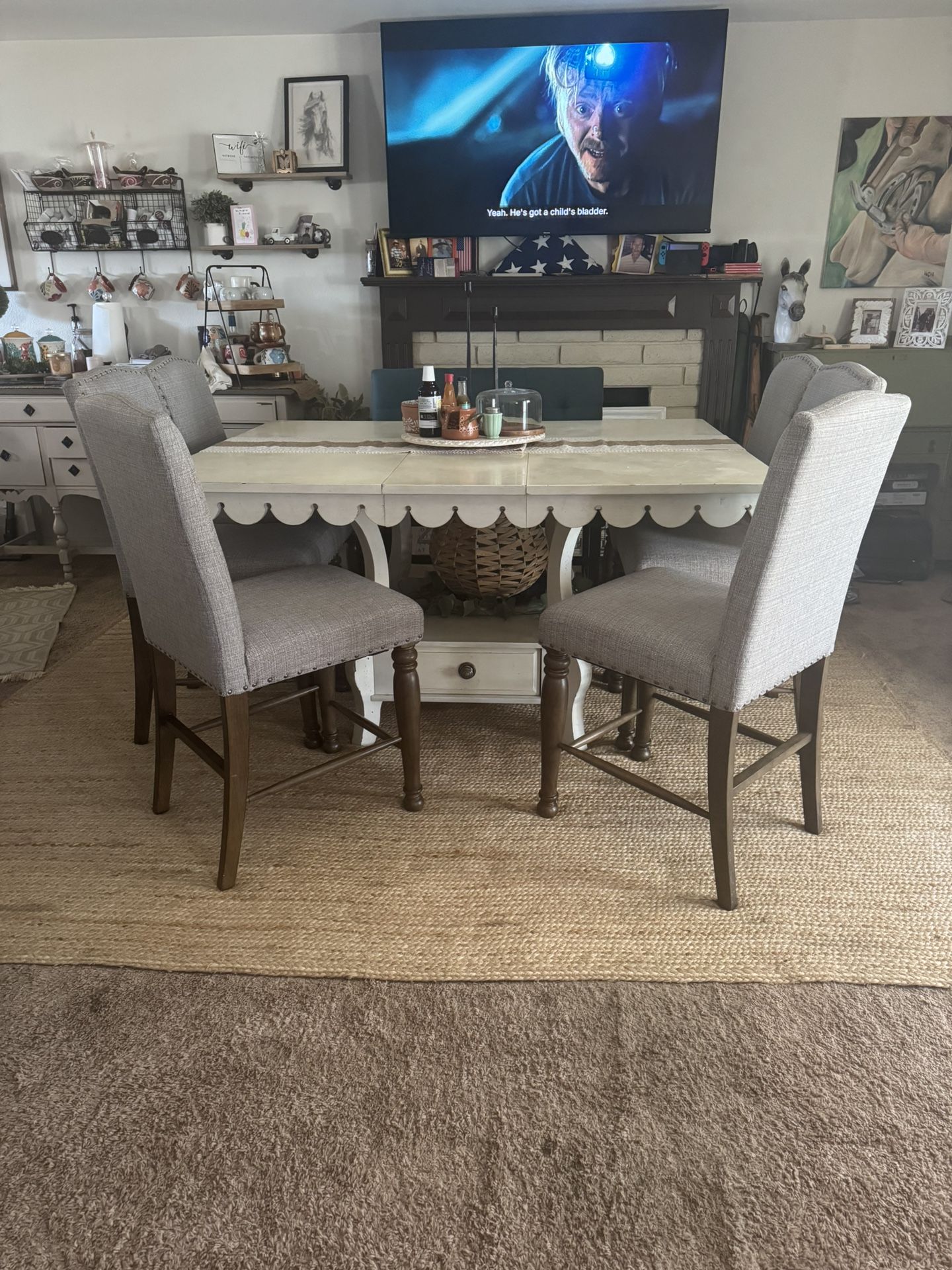This beautiful and unique piece has been with me for a long time. I love this piece and you can tell it has been well loved. We bought it new chairs about a year ago and they go with the table I paid 175 for each chair but you will need a new bench soon or two other chairs. Ashley’s still has this style in stock. The table is very heavy and very sturdy. Only reason I am selling it because is that we are moving and it doesn’t fit in the new home🥺