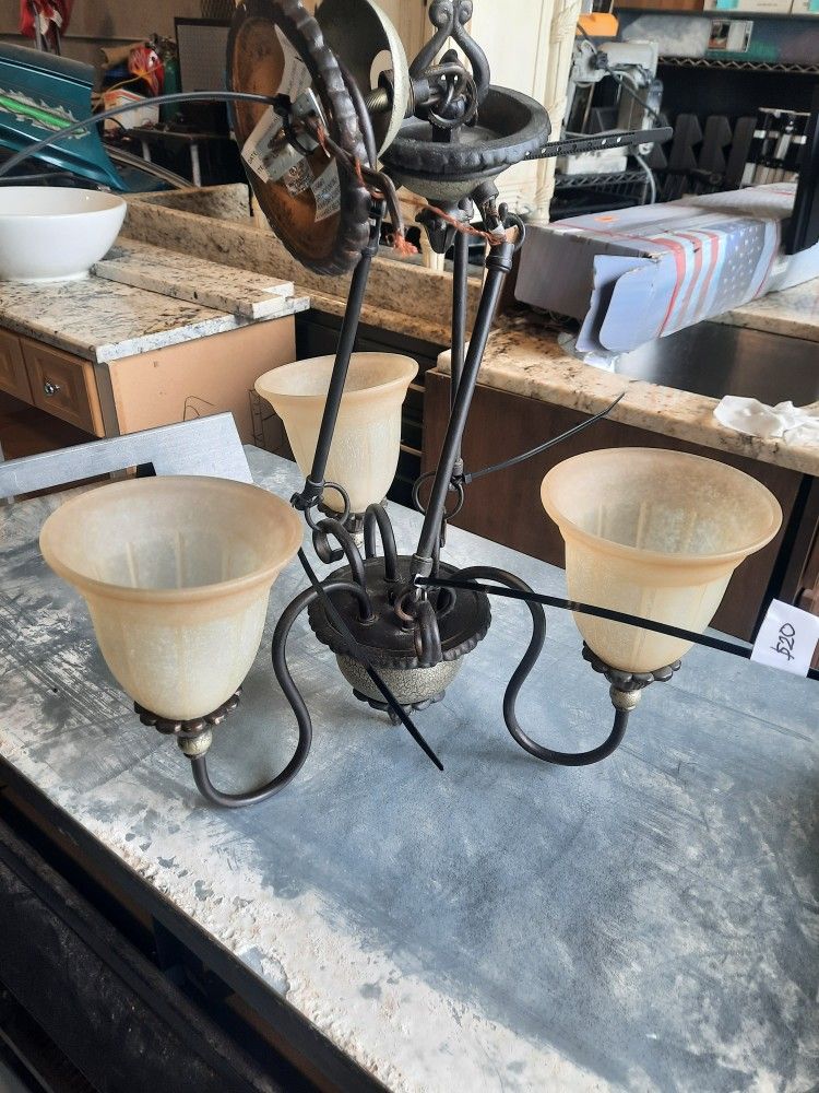 Classy Gold and bronze metal three sconce chandelier perfect for dining areas.