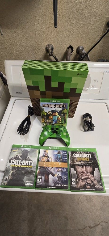 Xbox One S Minecraft Limited edition system in working condition. With wires controllers and a few games. There's one disc only game. Please check pictures or ask questions. Thank you