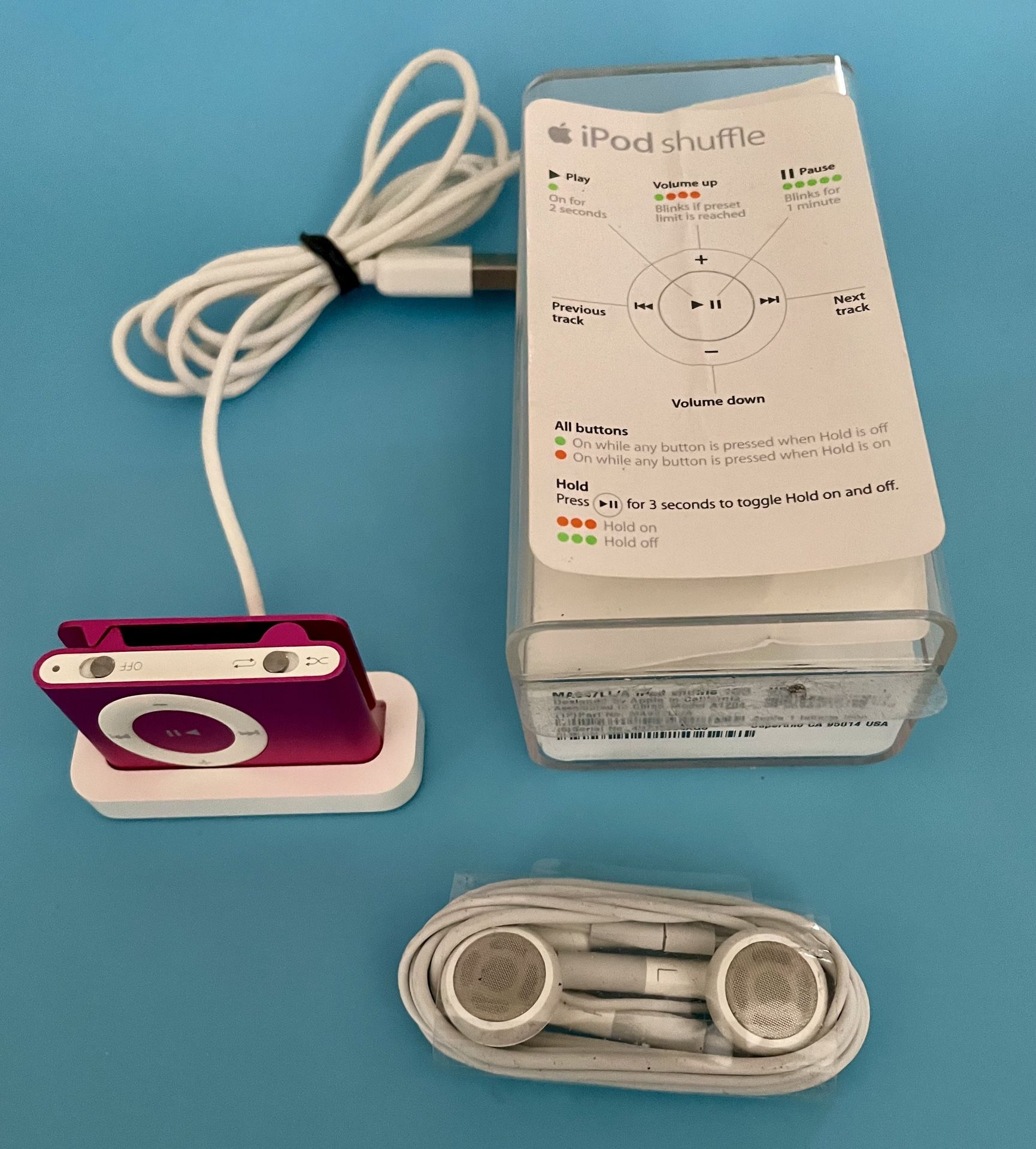 Apple iPod shuffle 2nd generation 1gb Hot pink Apple retail box with original Quick start guide New and unused Apple earbuds Apple charging stand Tested, music downloaded and everything works perfectly. The shuffle looks new!