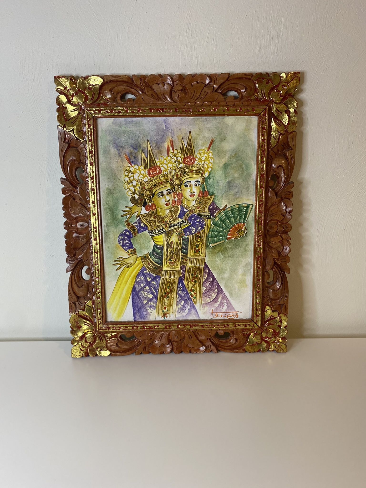 Bali watercolor painting signed by artist. Hand carved wood frame.