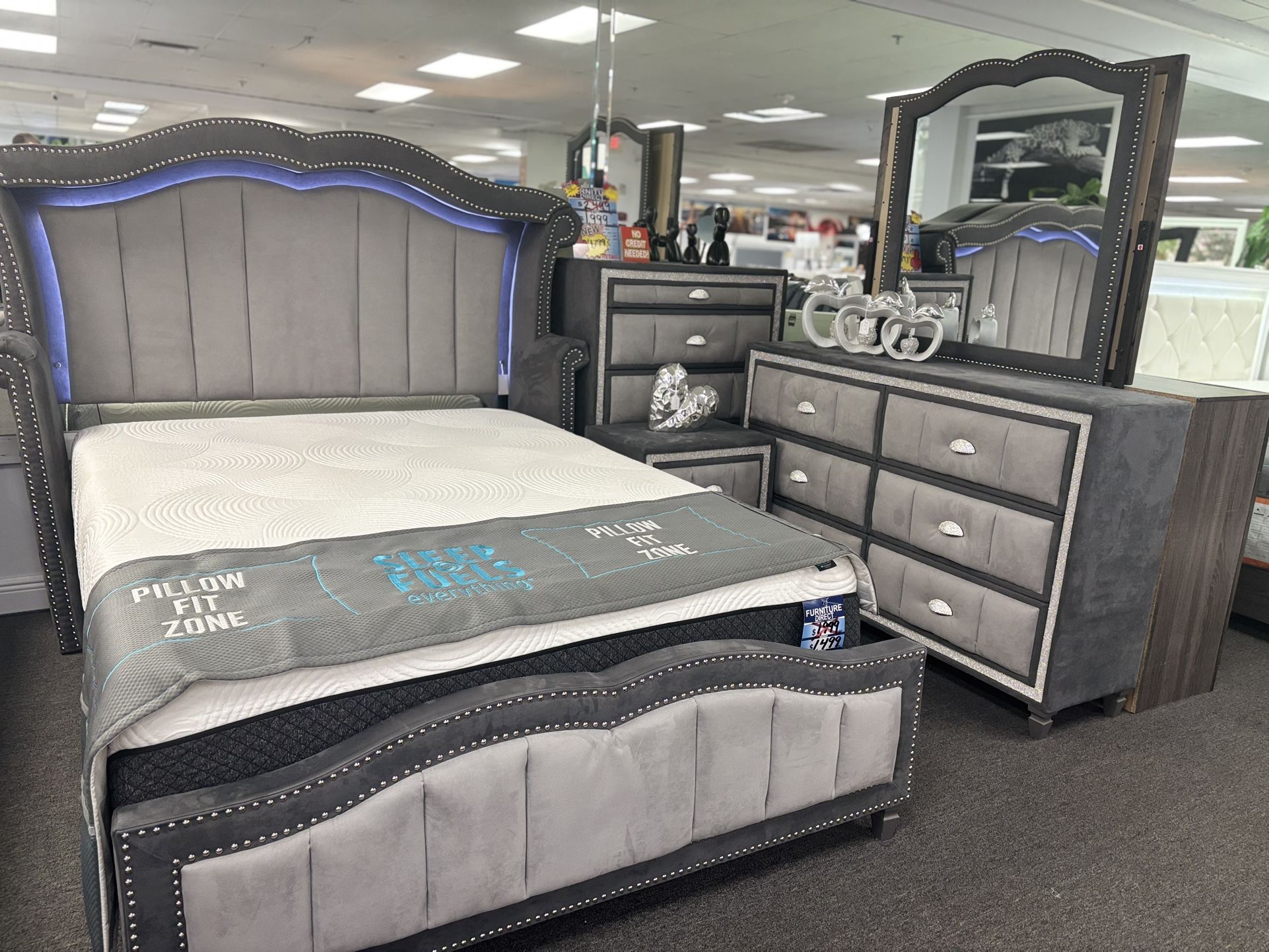 Gray 5pc bedroom set w/ built-in led lights and glitter accents for sale! Featuring a FREE MATTRESS AND NIGHTSTAND! LIMITED TIME OFFER! Send me a message ASAP!