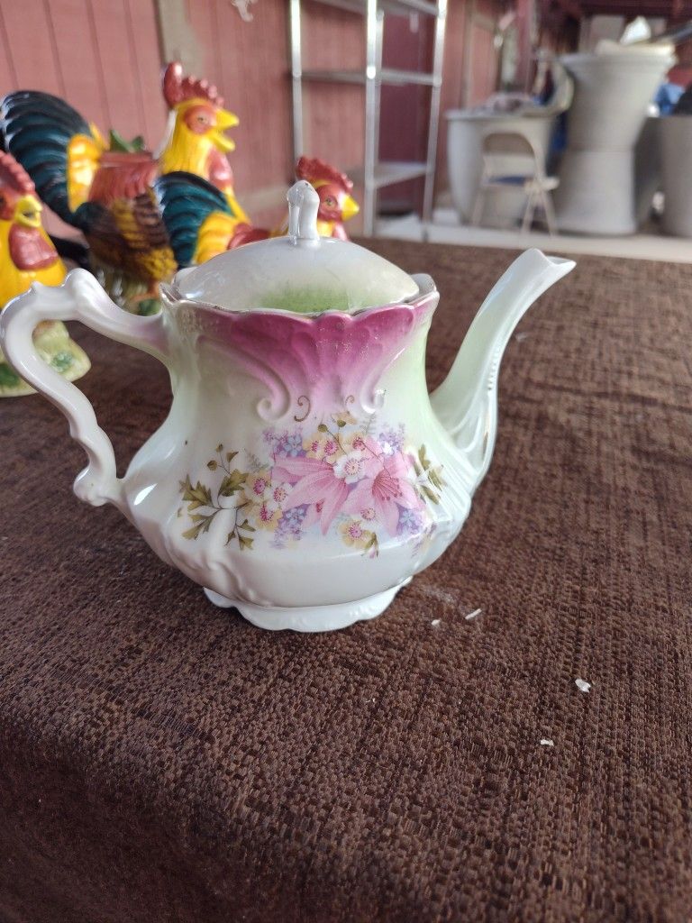 Antique R S Prussia Violets & Lilly of the Valley Hand painted Teapot pretty little Teapot. This piece is unmarked R.S. Prussia. Flower decor of Violets and Lilly of the Valley adorn this piece. Lid fits nicely. This Teapot will hold 2 cups of fluid. Well cared for little pot. Approx. Measurements: Spout to Handle 6 1/2", With lid 5 3/4" High. Dainty but Elegant serving piece. I find no chips, cracks or repairs.