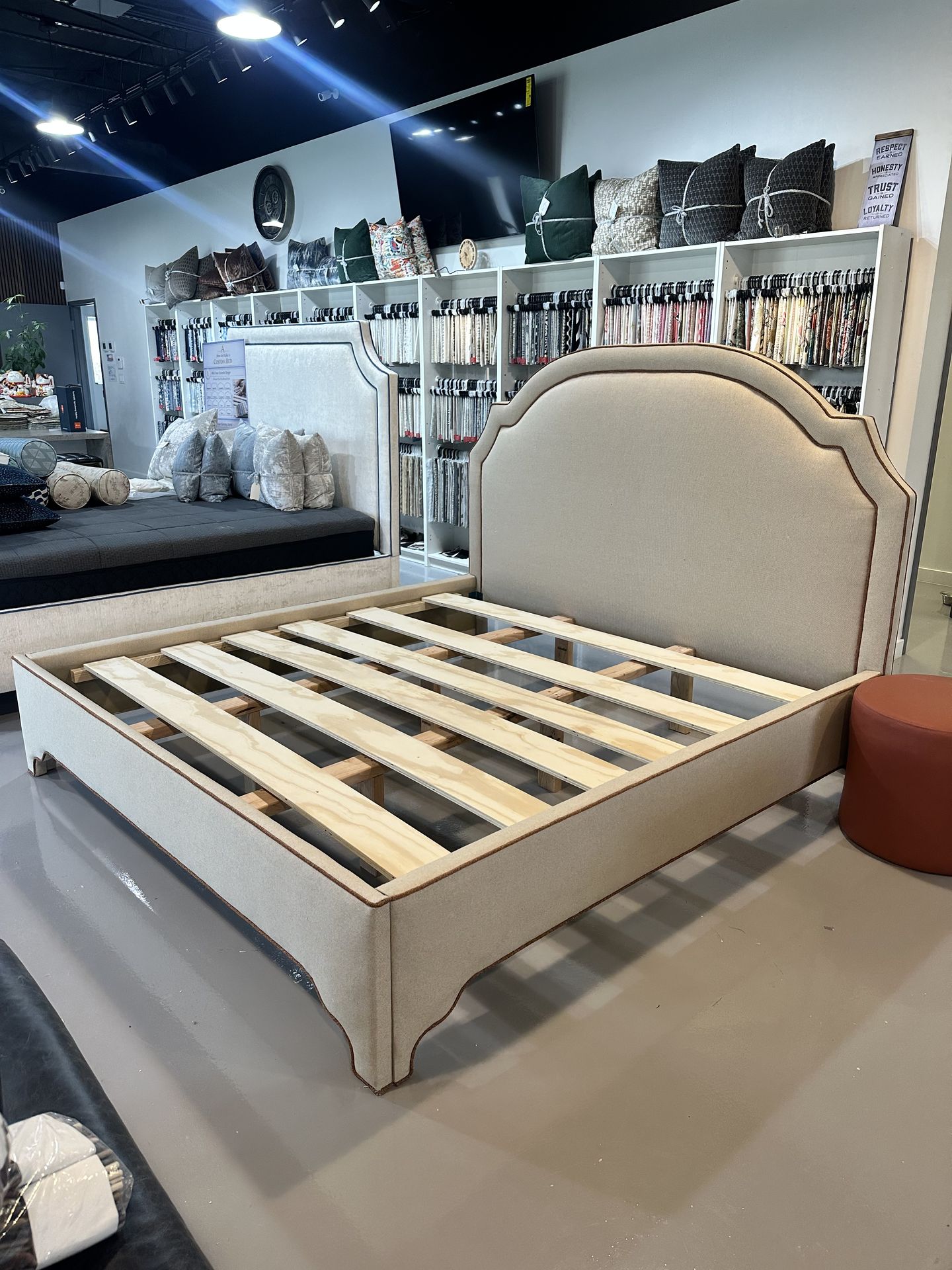 Custom bed/ build from scratch If interested don’t hesitate to message Fabric 80% polyester 20% Rayon Linen look beige and terracota cording. We can make any style you’ll like.