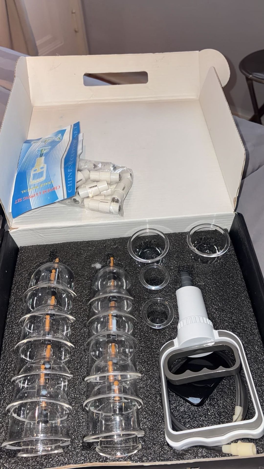 Complete Chinese vacuum cupping therapy set with hand pump and multiple cups. Comes with the instruction manual and different cup sizes for massage or therapy use.