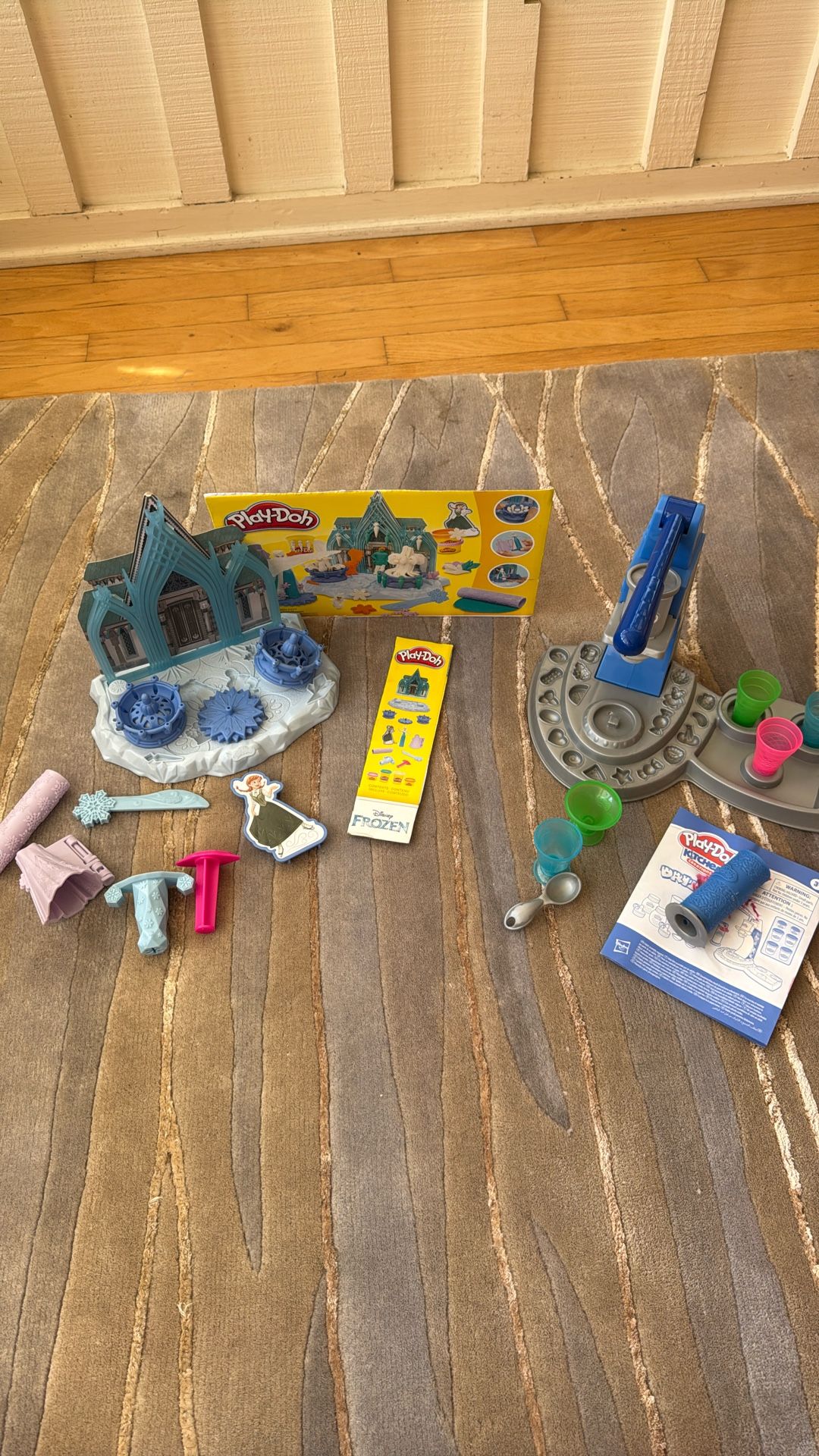 Play-Doh bundle including a Disney Frozen Ice Castle set plus Play-Doh kitchen/extruder tools and accessories. Includes multiple molds, tools, cups, and character pieces. Great for creative play and pretend baking. Gently used.