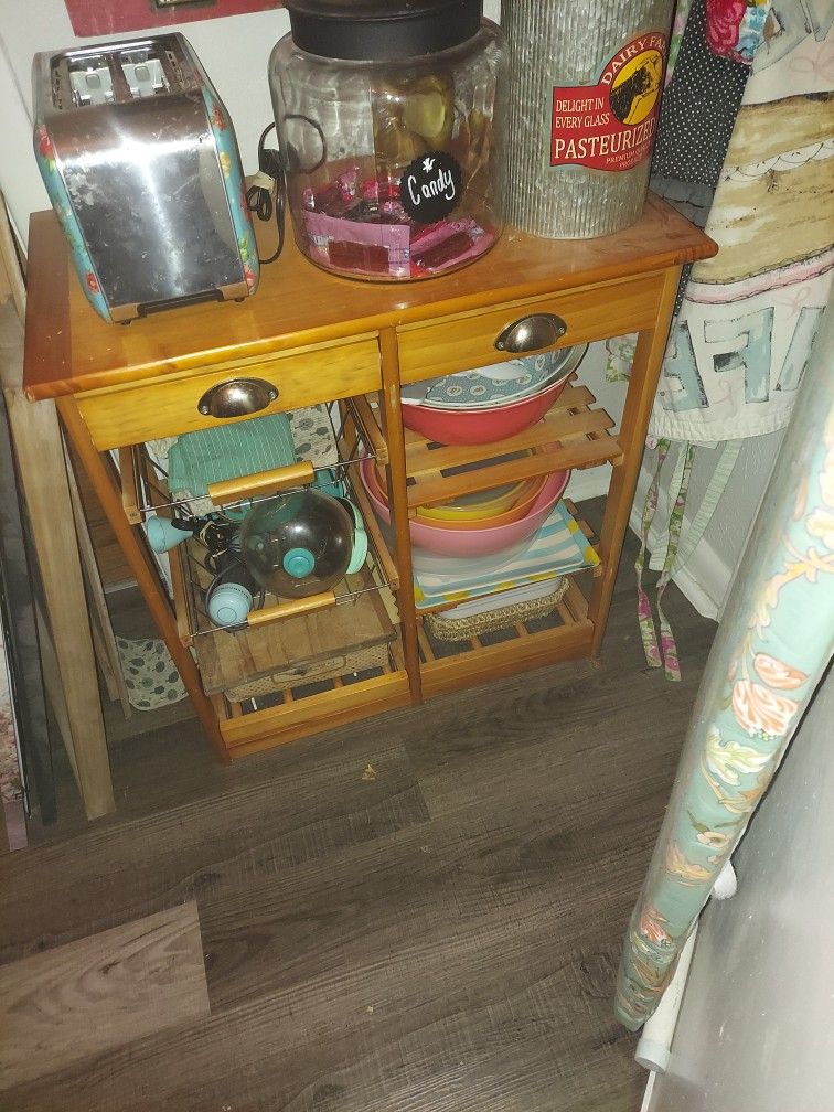 Kitchen cart 26" long, 27.5 " tall, 15" deep. Comes with wheels