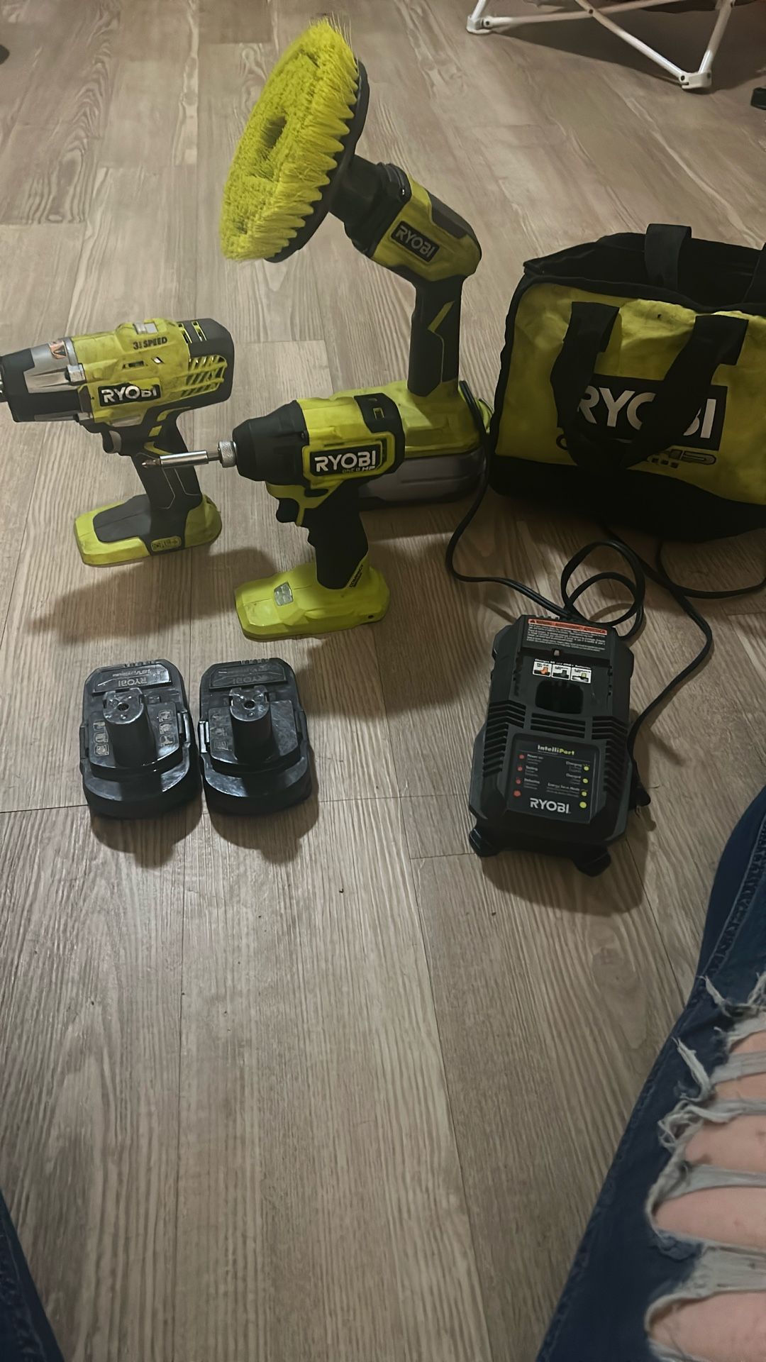 Ryobi drill with impact drill. With 2 batteries and charger. Also power scrubber and bag to carry accessories
