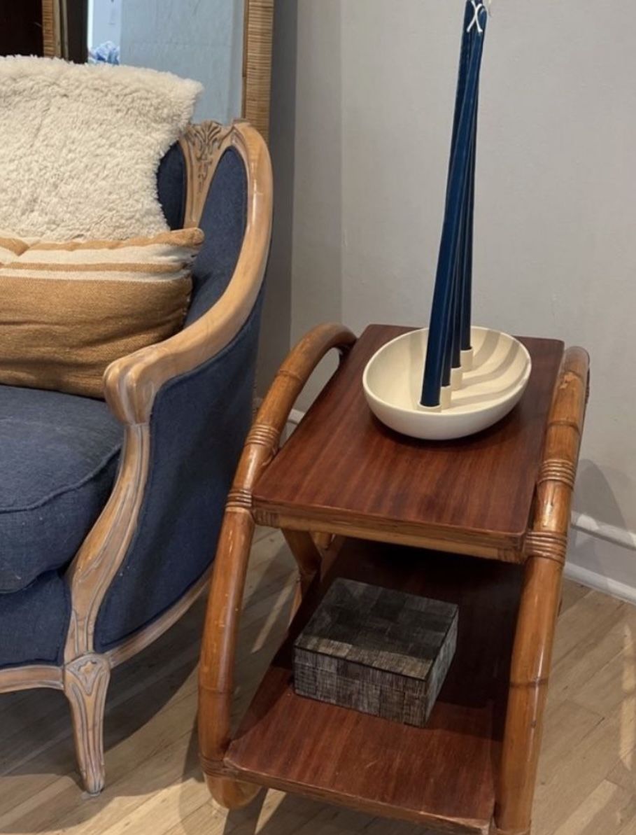 Original vintage condition, this Mid-Century Modern 1950 pretzel side table features bentwood bamboo in a beautiful and excellent condition . Two tiered table top levels are plywood with laminate . 34.5ʺW × 14.75ʺD × 22ʺH