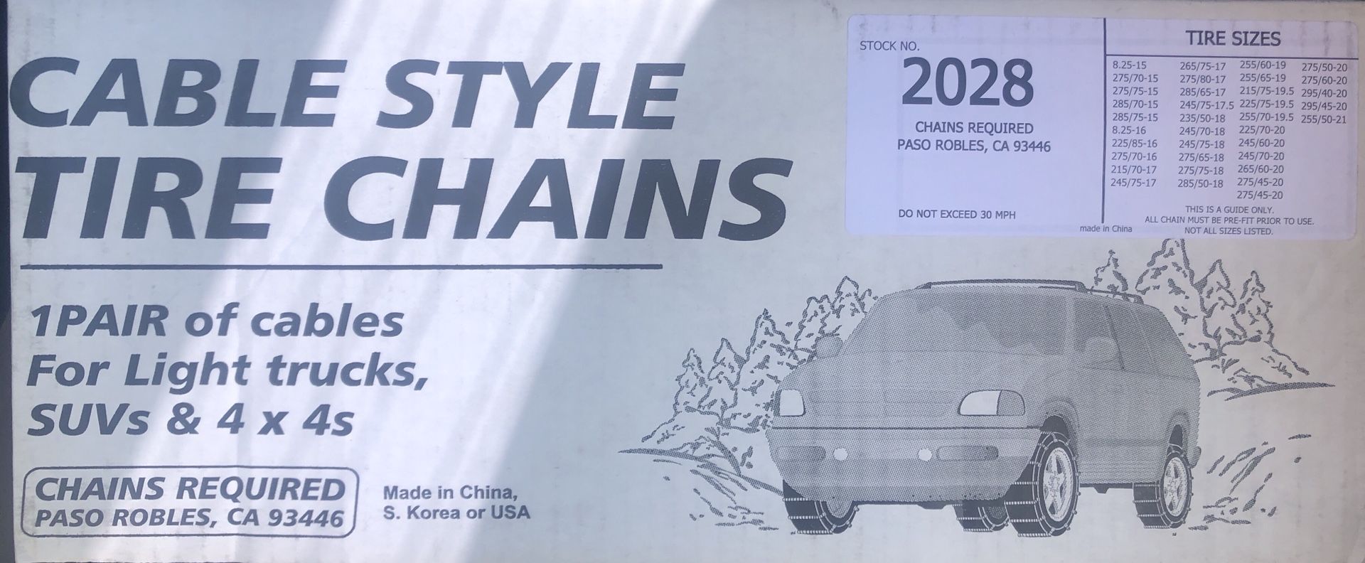 I bought them thinking I would need them but it was never required. Brand new. Please refer to second picture to look at sizes. $50.00 * I have another set for smaller vehicles/tires on my profile.
