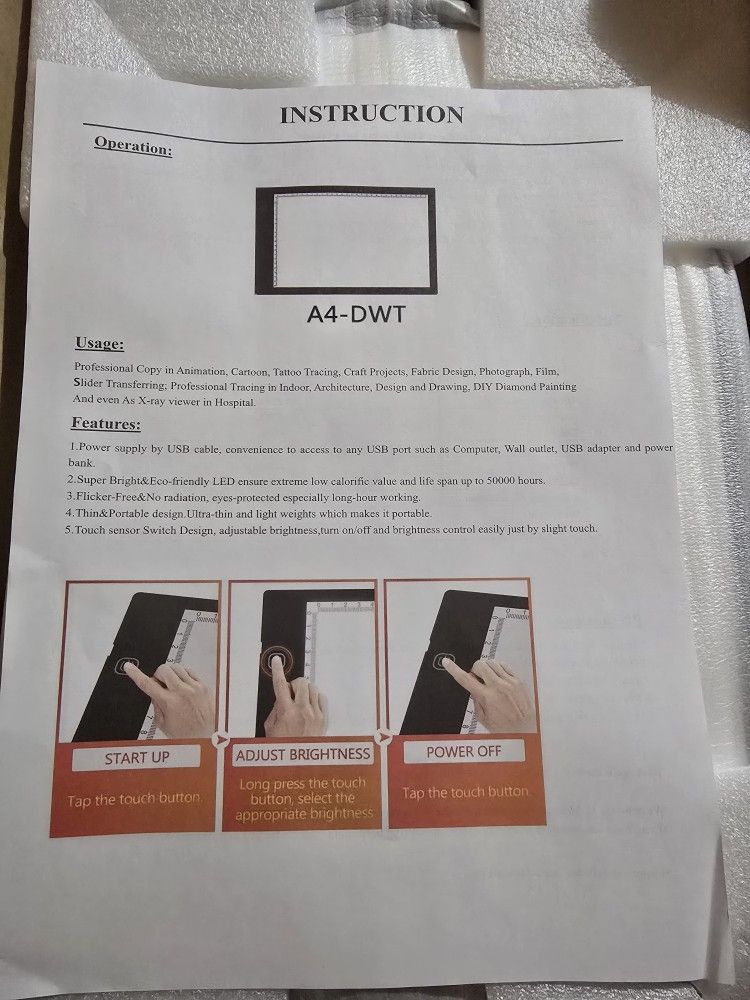 Brand new, A4 LED Copy Board Light Tracing Box Usage: Professional Copy in Animation, Cartoon, Tattoo Tracing, Crafi Projects Fabric Design, Photograph, Filim, Slider Transferring; Professional Tracing in Indoor, Architecture, Design and Drawing, DIY Diamond Painting And even As X-ray viewer in Hospital. Features: 1.Power supply by USB cable, convenience to access to any USB port such as Computcr, Wall outlet, USB adapter and power bank. 2.Super Bright&Eco-friendly LED ensure extreme low calorific valuc and life span up to 50000 hours. 3.Flicker-Free&No radiation, eyes-protected especially long-hour working 4.Thin&Portable design. Ultra-thin and light weights which makes it portable. 5.Touch sensor Switch Design, adjustable brightness, turn on/off and brightness control casily just by slight touch.
