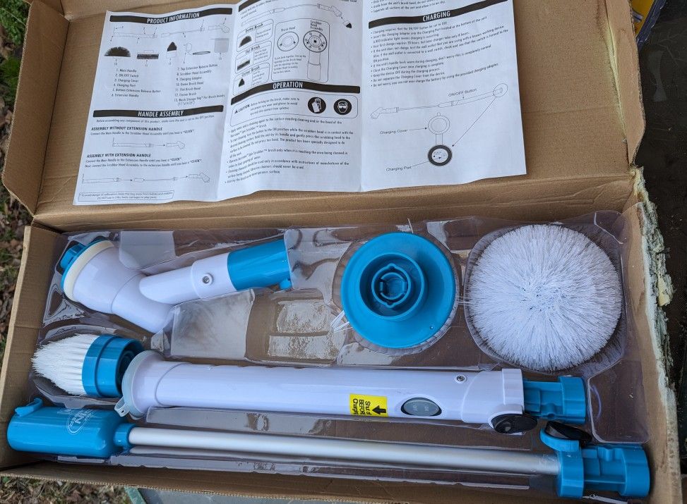 Comes With A Chargeable Staff , Extension Staff , AC Charger , Round Brush , Flat Round Brush , And A Pointed Brush For Corners. Easy to operate . Heads with brushes pop on and off conveniently. Light Weight and durable. It's practically brand new ... !!!