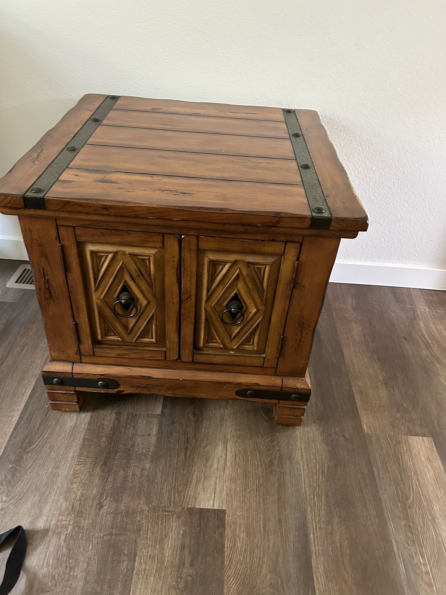 Beautiful solid oak end table. Has a lot of storage inside. Just don’t have room for it in our new home. It has a few minor wear marks. 26 x 26 x 24 Smoke free, pet friendly home.