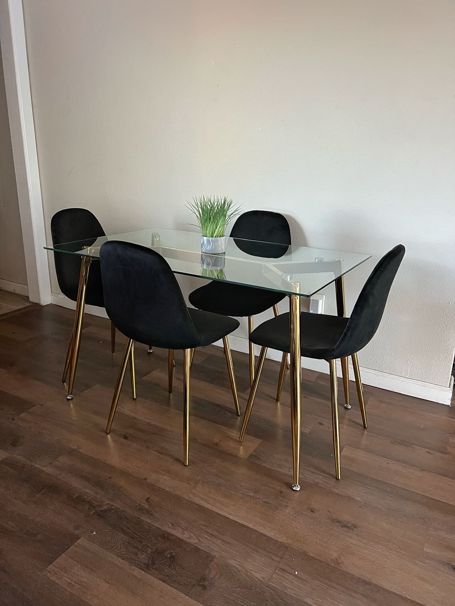 Brand New - We are a furniture store - Pickup / Delivery - High quality, modern table - Glass table top, gold chrome legs -4 Chairs Included Dimensions: Rectangle Table 47” W x 30" H x 28” D