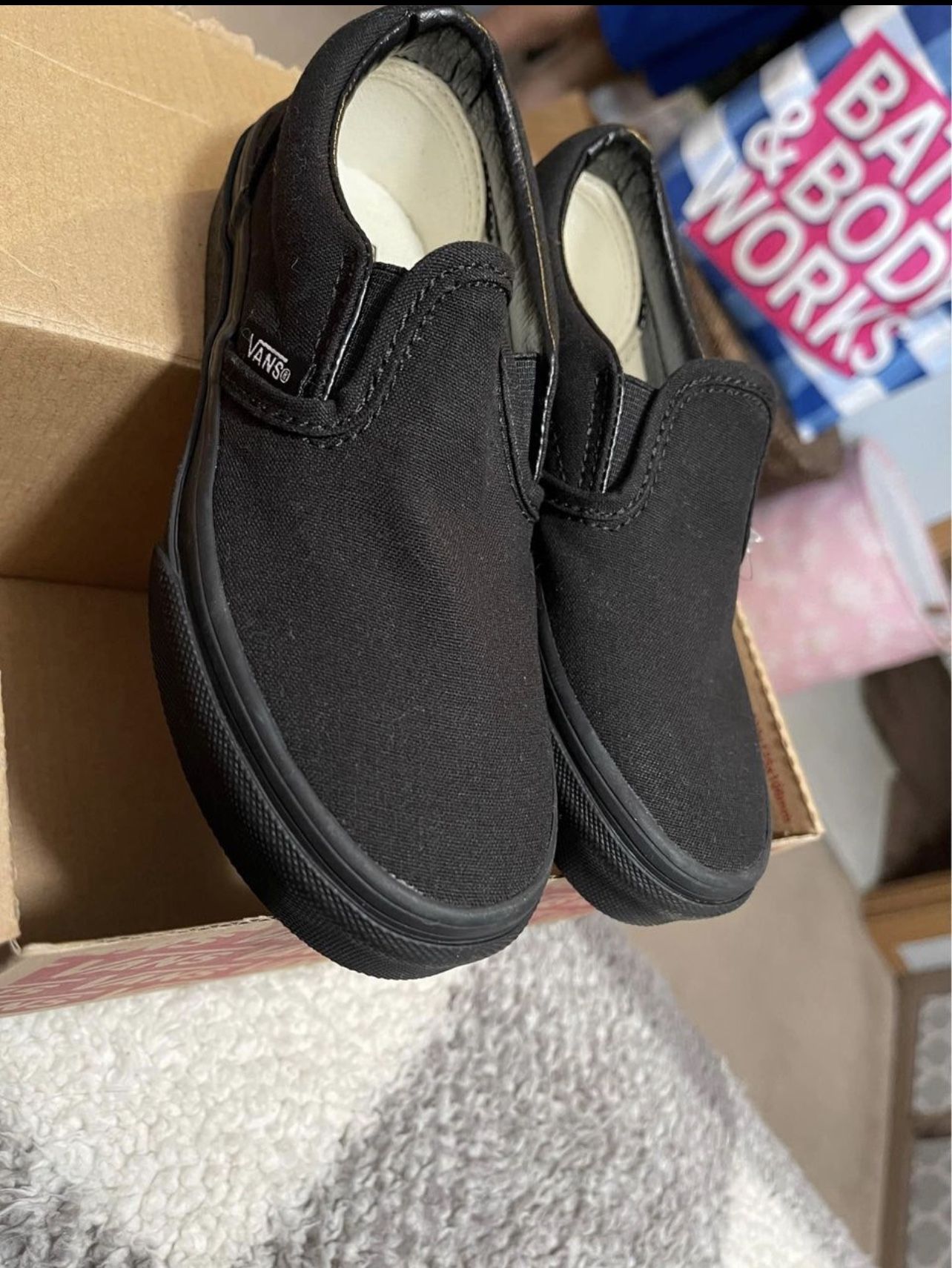 Slip on black vans. Kids size 13. Brand new. My kid outgrew it before we could use them.