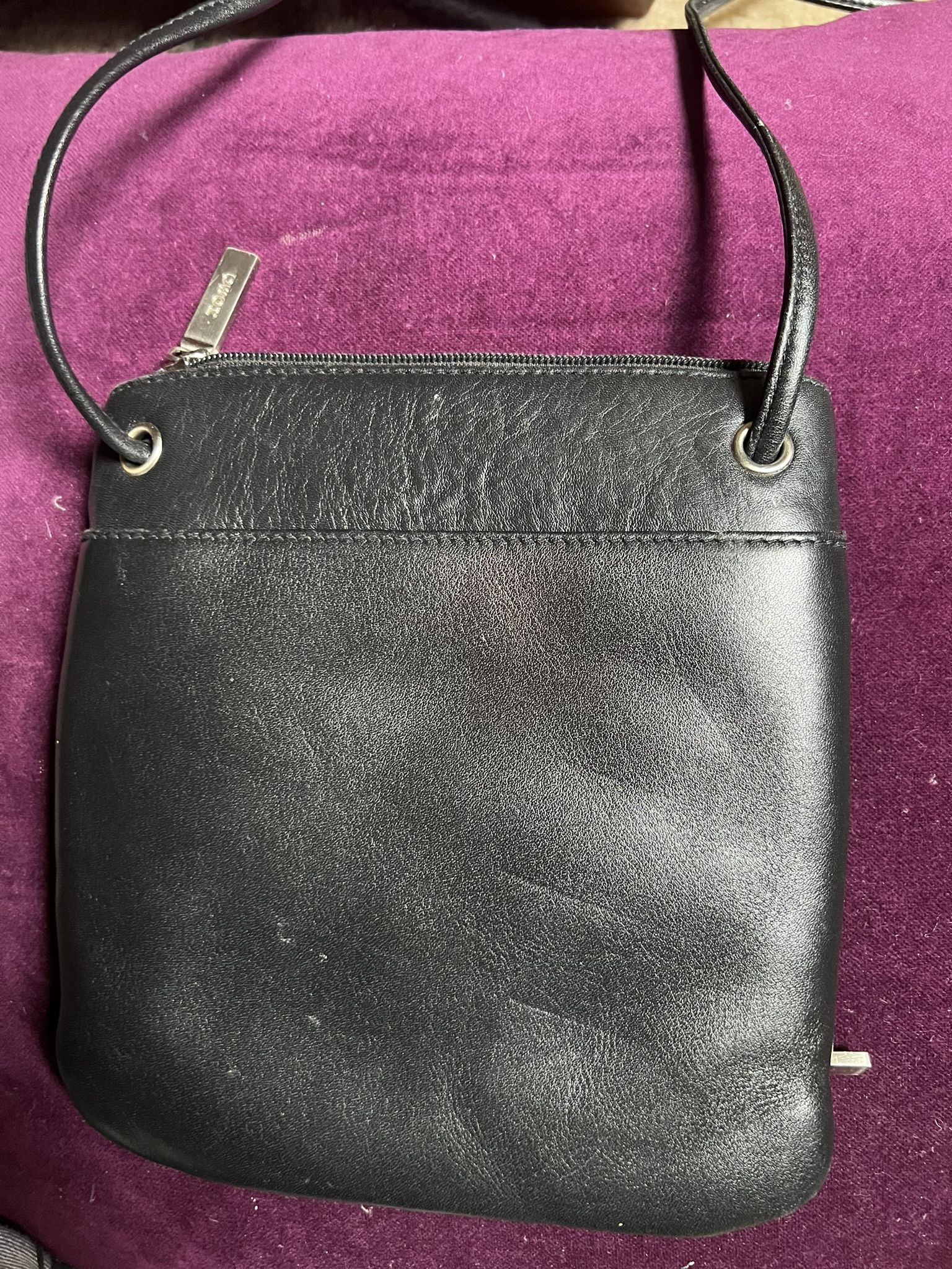 Slate blue lining Silver hardware Lightweight 7" across x 8" tall 1" deep front to back adjustable strap drops the bag to about 26". Porch pickup