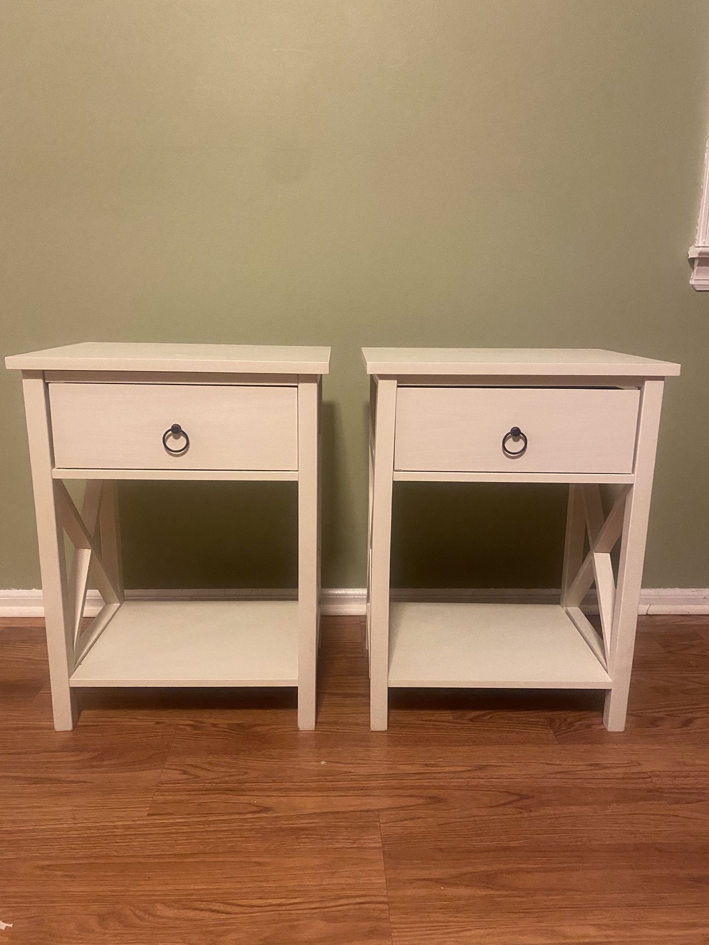 Simple and clean farmhouse-style nightstand set Small defect on one of the tops, but otherwise good condition 21”H x 16”W x 12”D