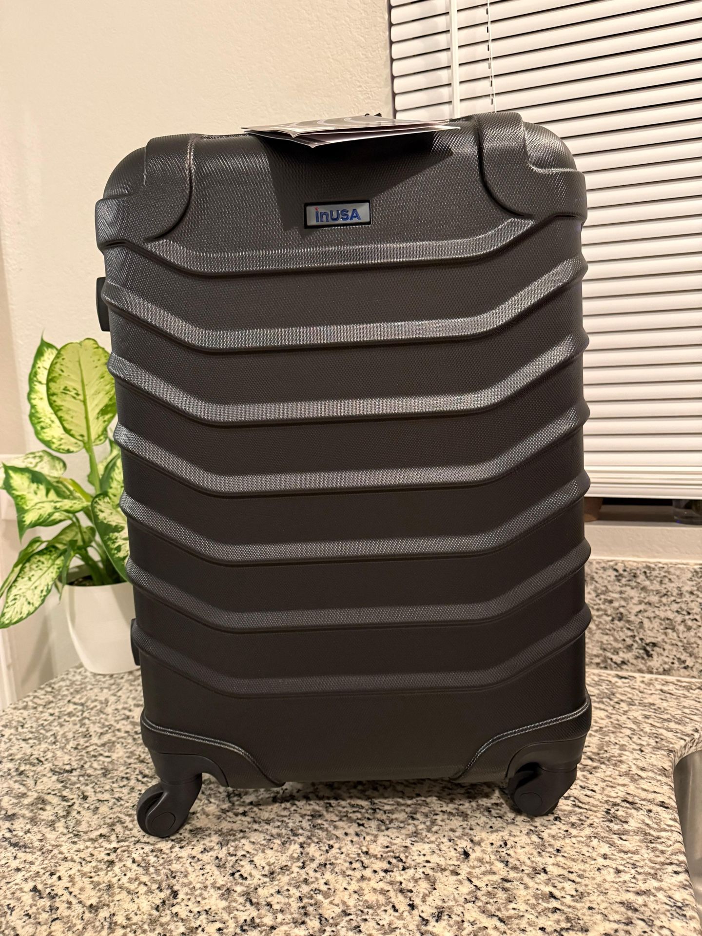 Brand new inUSA hardshell suitcase. This sleek luggage has 4 spinner wheels, gel handles, and a trolley system. It has full interior fabric lining. Maleta rígida nueva en EE. UU. Este elegante equipaje tiene 4 ruedas giratorias, asas de gel y un sistema de trolley. Cuenta con un forro interior completo de tela.