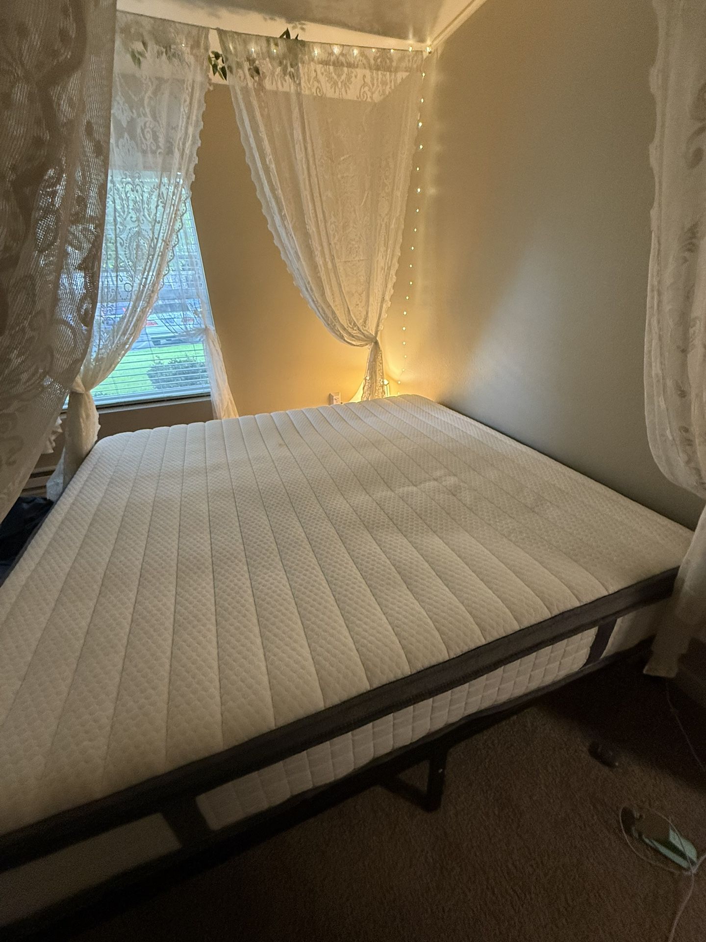 King Size Bed Set — Hybrid Mattress + Metal Frame Selling a gently used King-size 12” hybrid memory foam mattress + sturdy black metal platform frame. Mattress is medium firm and super comfortable, used with care. Small cosmetic stain (shown in photo), otherwise like new. Frame is solid and easy to assemble. Prise for both . Smoke-free home, no pets.
