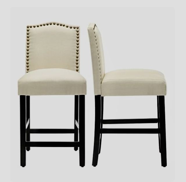 GOTMINSI 4 upholstered beige counter height 4 barstools with antique gold nail heads solid wood.