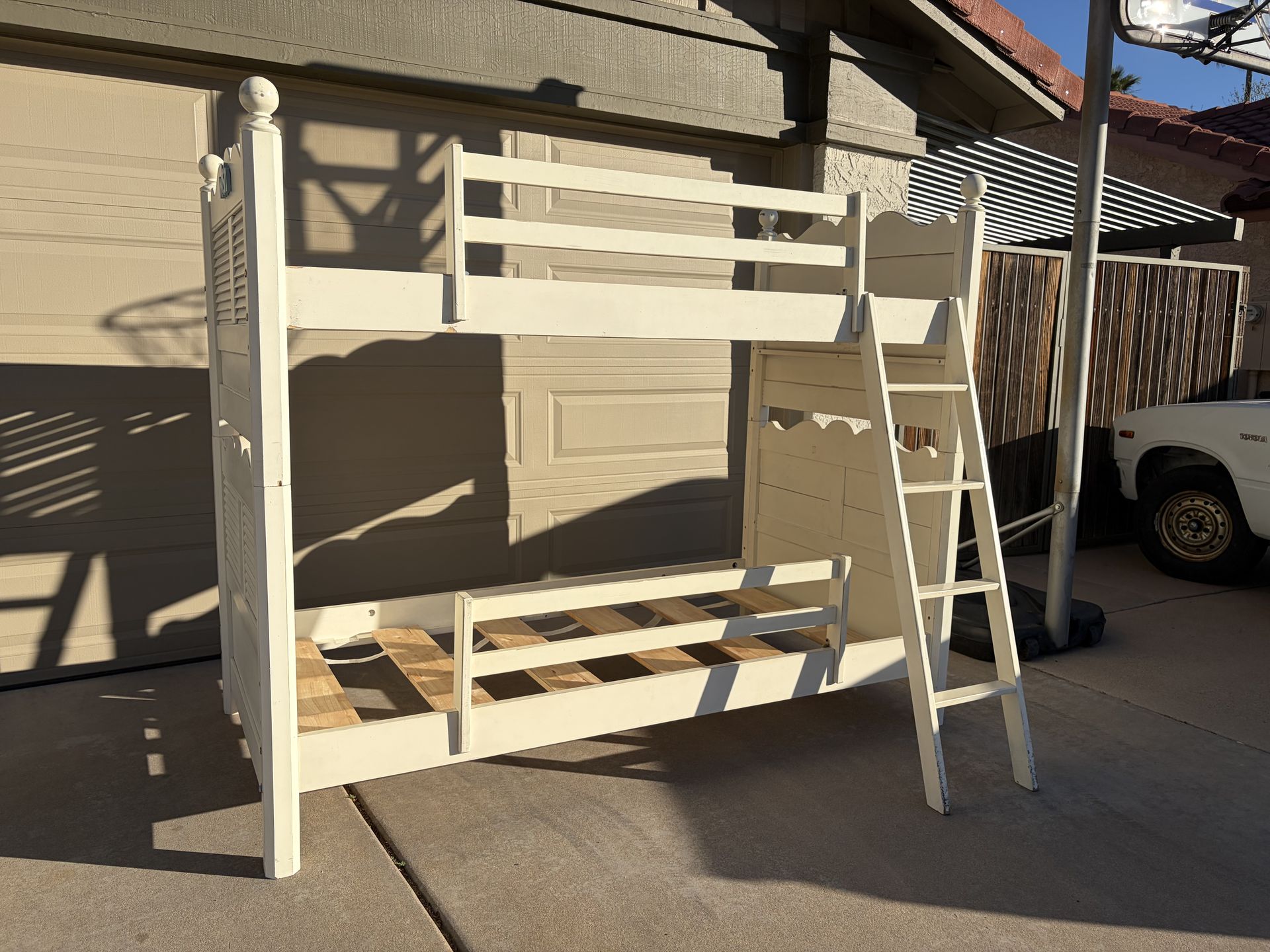 Lexington cottage cream bunk bed. Lightly distressed ( intentional). Beautiful set with shuttered sides and ball finials. Includes mattress slats, bedside rails and ladder. Will throw in matching side table for $10. Moderate wear and tear but many years left! Adorable. Firm price.