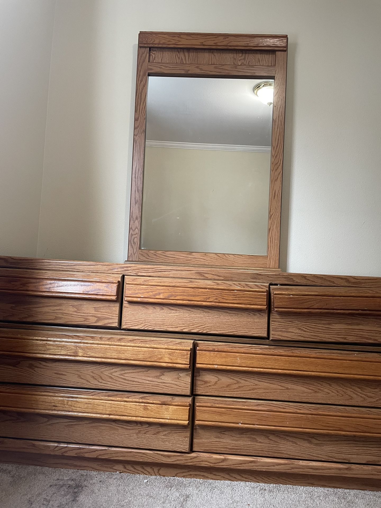 Oak dresser with mirror, have 7 drawers, no defect. Drawers are bit difficult to open and close Need 2 person to pick