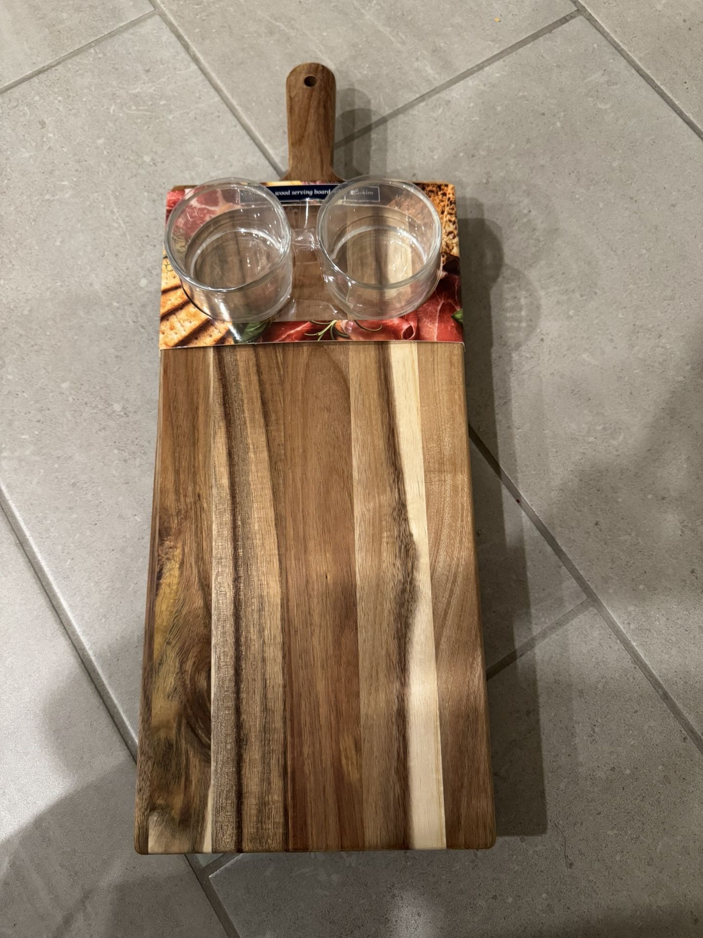 New Unopened Wooden chopping board with a pair of Ramekins.