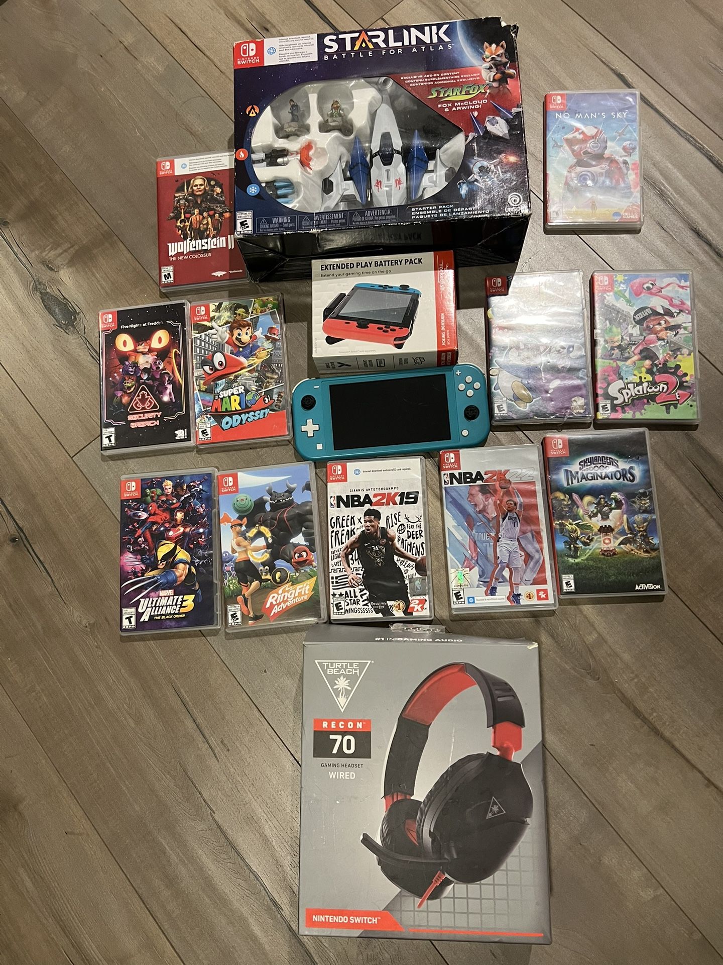 Nintendo switch lite has has been used a lot as and the rubber on the joystick’s came off but still functions normally. Has been factory reset and comes with a wired turtle beach headset, extended play battery pack and 12 Nintendo switch games. Games: - Starlink Battle For Atlas - No Man’s Sky - Wolfenstein II - Five Nights at Friday - Super Mario Odyssey - Penguin Wars - Splatoon 2 - Ultimate Alliance 3 - RingFit Adventure - NBA 2k19 - NBA 2k22 - Skylanders Imaginators Does NOT come with charger or any other accessories. Please check pictures as everything is the photos will come with it.