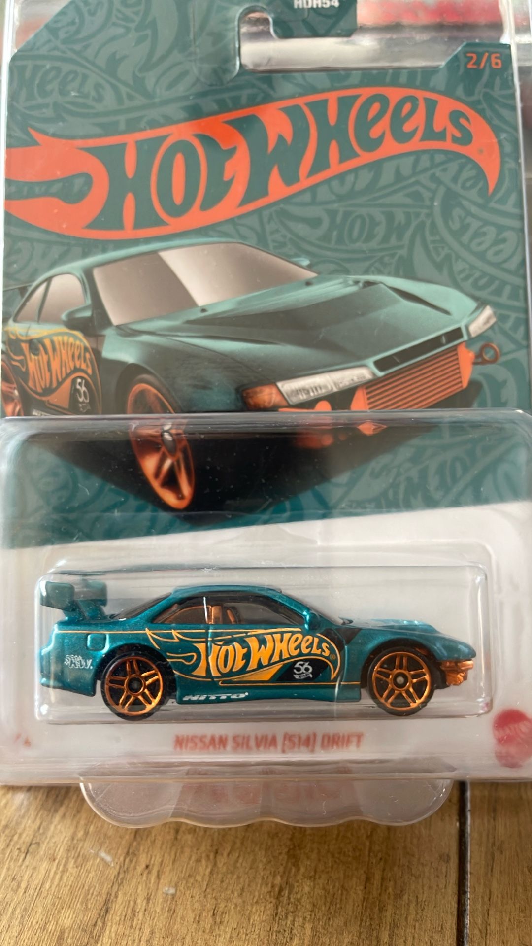 This is a Hot Wheels 2024 56th Anniversary Pearl and Chrome Nissan Silvia (S14) Drift die-cast car. It is part of the "Pearl and Chrome" series, which celebrates the 56th anniversary of Hot Wheels. The car has a metallic teal/turquoise finish with copper-colored wheels and accents. It is a 1:64 scale model and part of the "Drift Series".