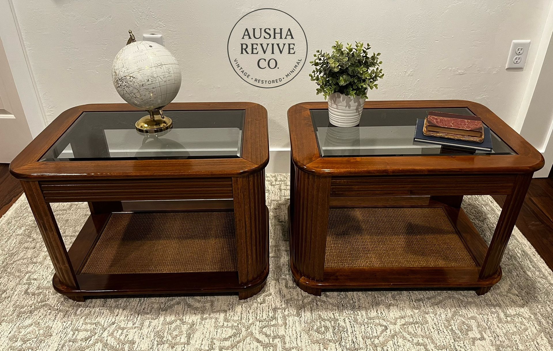 Beautiful vintage solid wood end tables, sold as a matching pair. Classic reeded design, lower cane shelf, and warm wood tones that work well with traditional, mid-century, or transitional interiors. Both tables are sturdy, clean, and ready to use. They’ve been refreshed and well cared for, with smooth surfaces and a timeless look. Perfect for a living room, bedroom, or sitting area. Details: • Solid wood construction • Matching pair • Lower cane shelf for books or décor • Clean, well-kept condition