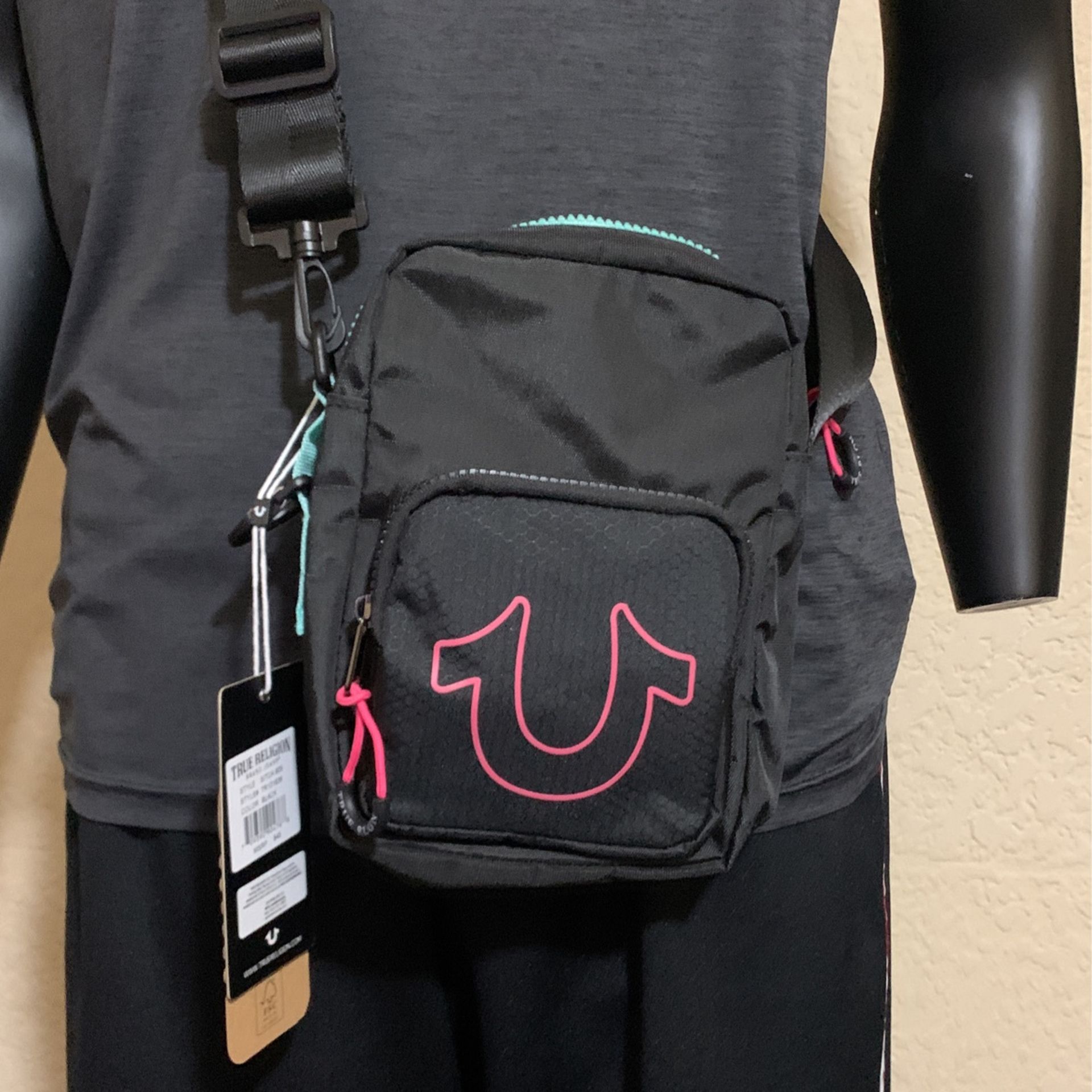 True religion crossbody bag with key ring/water bottle ring Miami vice/Miami heat colorway Pink/teal/black $35 Pick up or local meet up only
