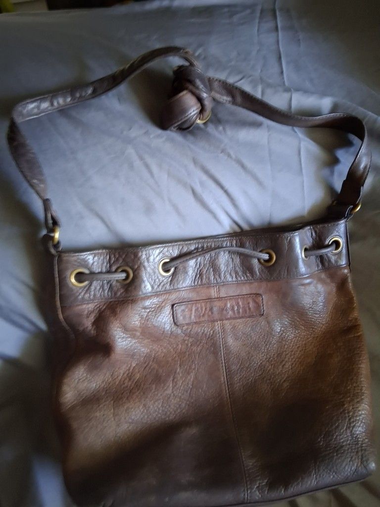VTG FOSSIL CROSSBODY SHOULDER BUCKET BAG BROWN PEBBLE LEATHER FRONT&SIDE POCKETS