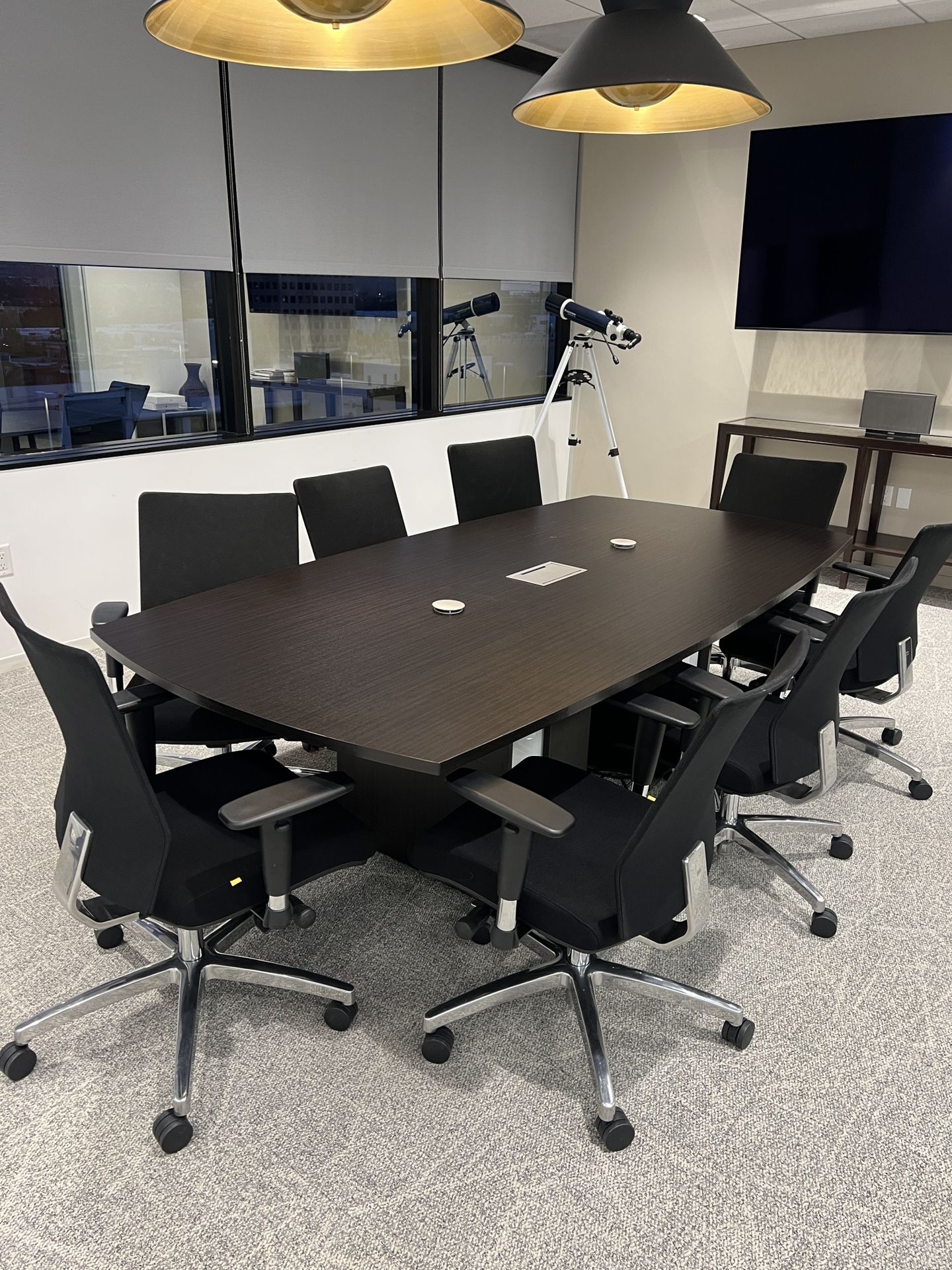 Purchased this entire set for over $6,000 retail Condition: Brand New / Like New (Can Verify In Person) Chairs: 8 Executive iDesk chairs included Style: Minimalist / Professional. Functionality: Fully cable-managed for a clean, wire-free look. Modern Conference Table: Large, dark wood grain finish with a curved "boat-style" top. Integrated Power Hub: Built-in silver flip-top media/power port (includes AC outlets, VGA, and Ethernet ports) for seamless connectivity. 6 iDesk Executive Chairs: High-performance ergonomic task chairs with breathable black mesh backs, adjustable armrests, and polished chrome bases on rollers.