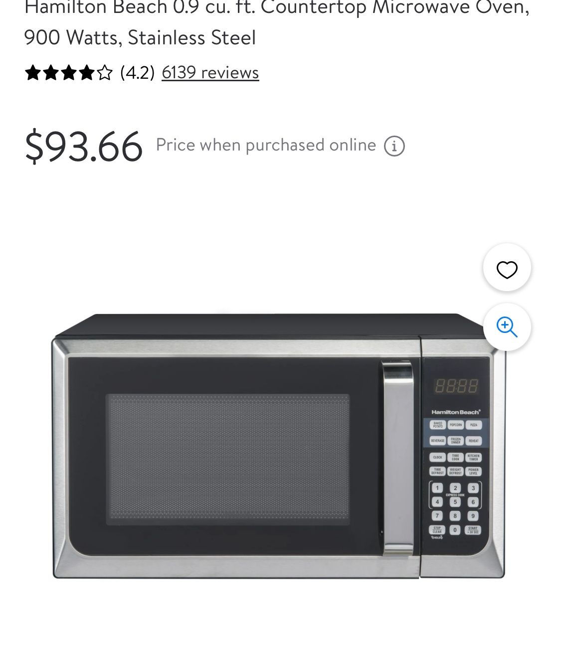Hamilton Beach O.9 cu. ft. Countertop Microwave Oven, 900 Watts, Stainless Steel