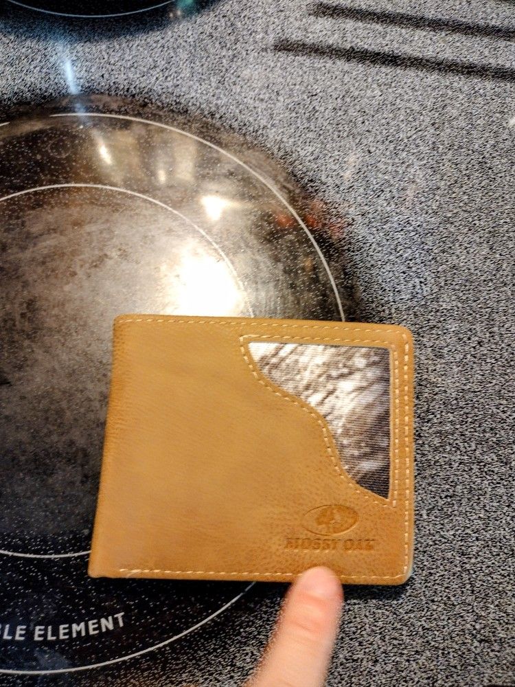 Mossy Oak Camouflage Leather Bifold Wallet Tan, brand new without tags and box, dark brown on inside.
