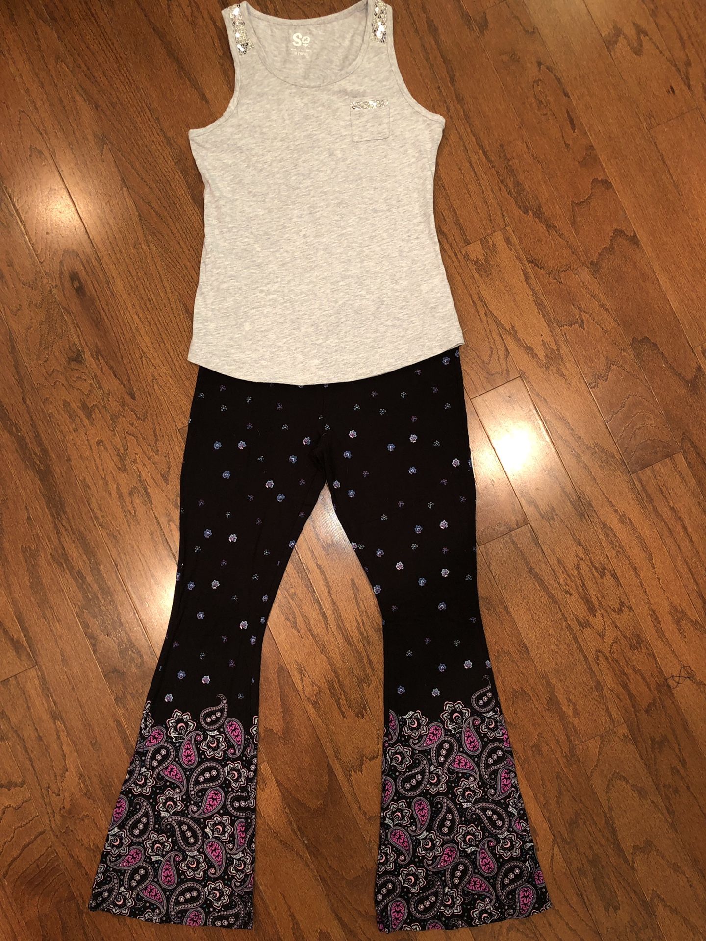 This outfit was worn once. Practically new! Size 10/12. Grey tank with sequin detail on the pocket, shoulders, and upper back. Black legging-feel bell-bottoms with flower & paisley detail. *Please see my other offers as well! Thanks!*
