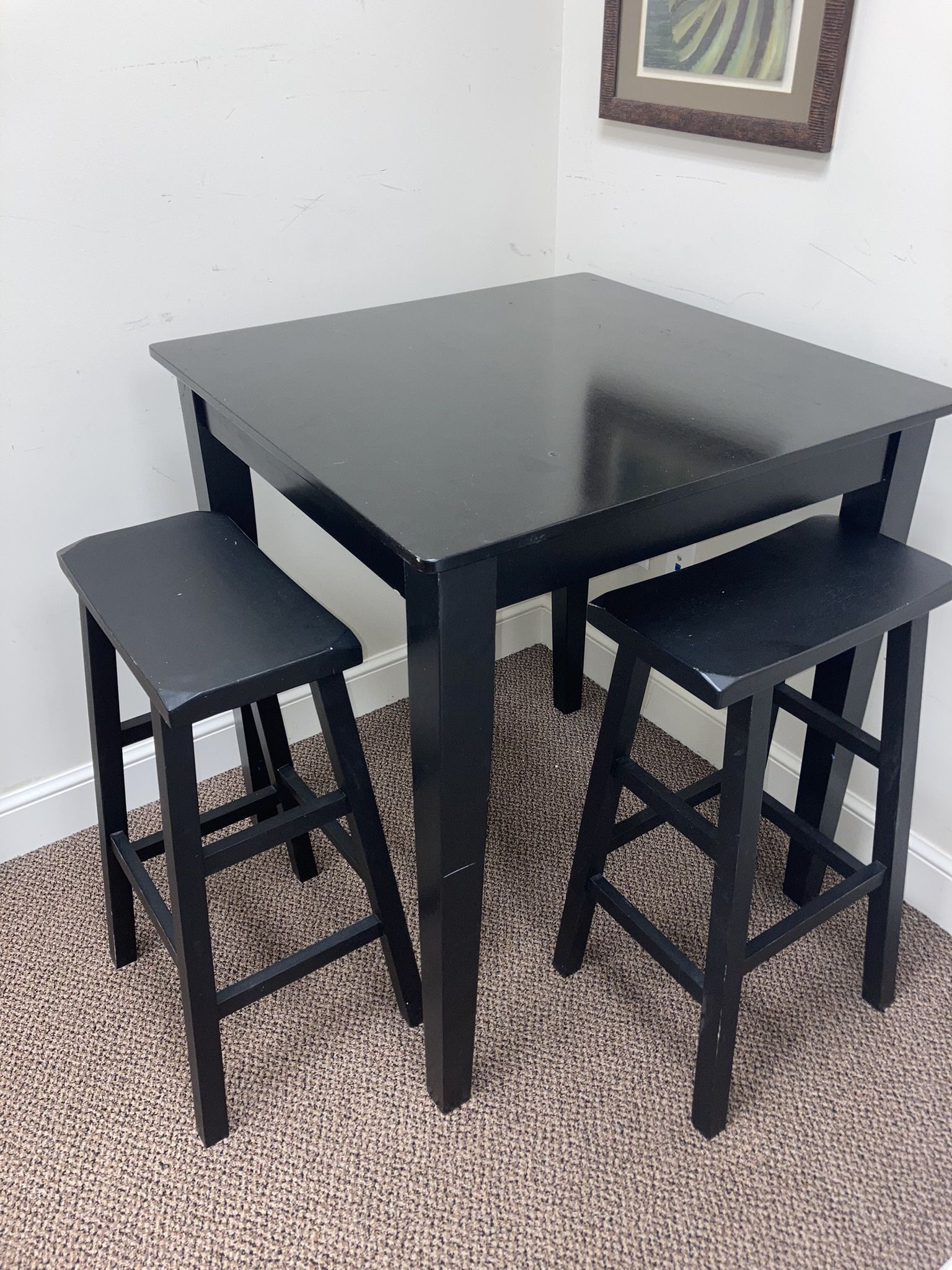 Bar height table with two chairs, black in color